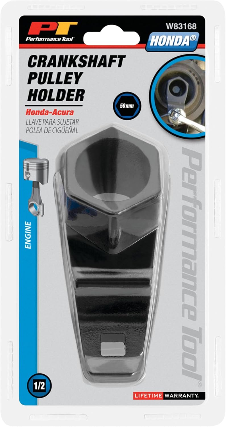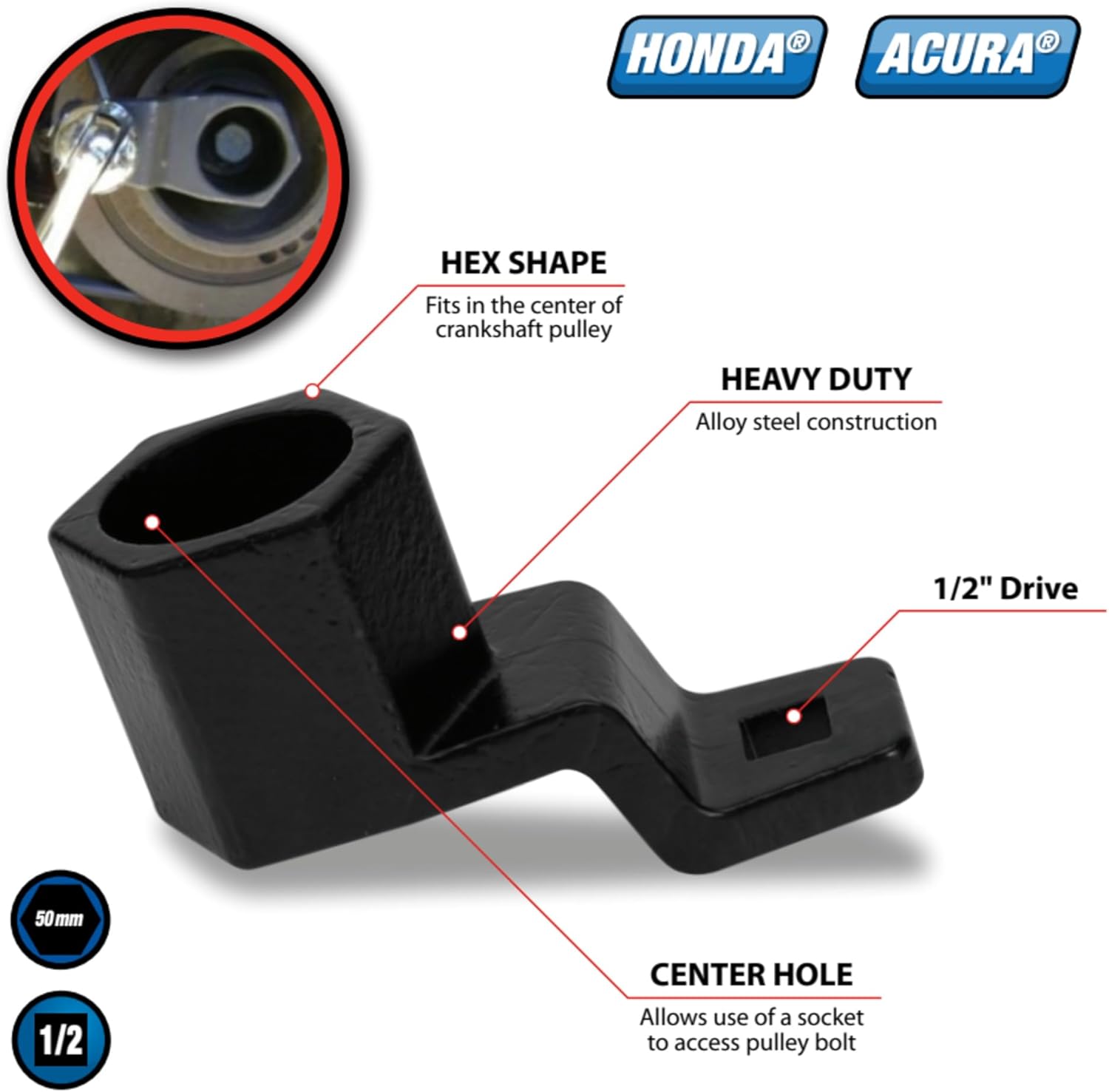 For removal and installation of Crankshaft pulley bolt. Fits most Honda and Acura engines. 50mm diameter. Hex shape fits hole in center of Crankshaft pulley. Prevents engine from turning when Held with Breaker bar. Not for impact use.