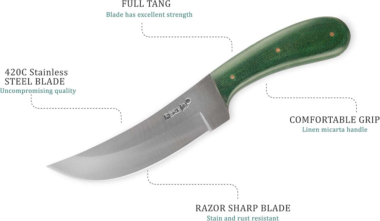Blade Length: 5 inches Handle Length: 4 inches full tang Micarta handle 420C Stainless Steel blade Over all length: 9 inches Blade width: 1.4 inches