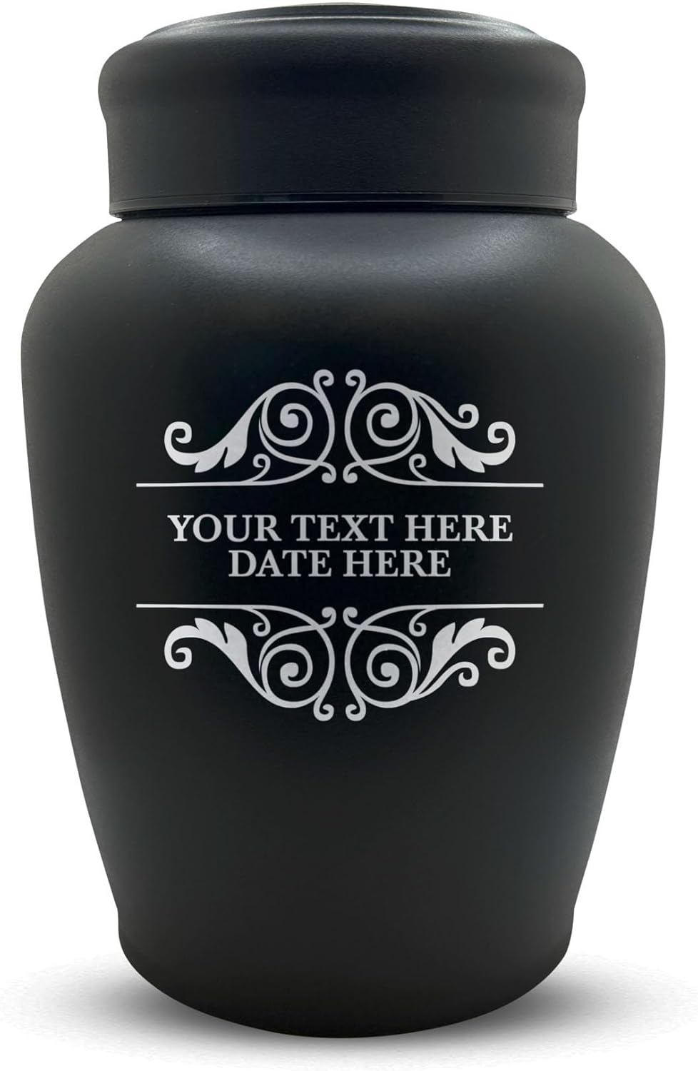 Introducing our Personalized Human Cremation Urn, a beautifully crafted memorial that seamlessly blends into any home or columbarium, providing a heartfelt tribute to your loved one. Measuring approximately 8.2" x 6.5" at its widest point and holding up to 150 cubic inches, this urn is designed to accommodate individuals weighing up to 150 lbs prior to passing. The urn features a striking 2.8" full-color photo framed in silver, which is added using a specialized durable film/sticker, ensuring that your cherished memories are preserved with elegance. The text, including the individual’s name and date, is permanently engraved, offering a dignified way to remember those who have passed. Crafted from stainless steel with a powder coat finish, this urn combines durability with an elegant aesthetic, and the threaded lid provides a secure seal to protect your loved one's ashes. Each urn is personalized in the USA, making it an affordable and meaningful choice for creating a lasting memorial. Embrace the opportunity to honor your loved one with a tribute that is not only beautiful but also truly personalized, ensuring their memory shines brightly for years to come.