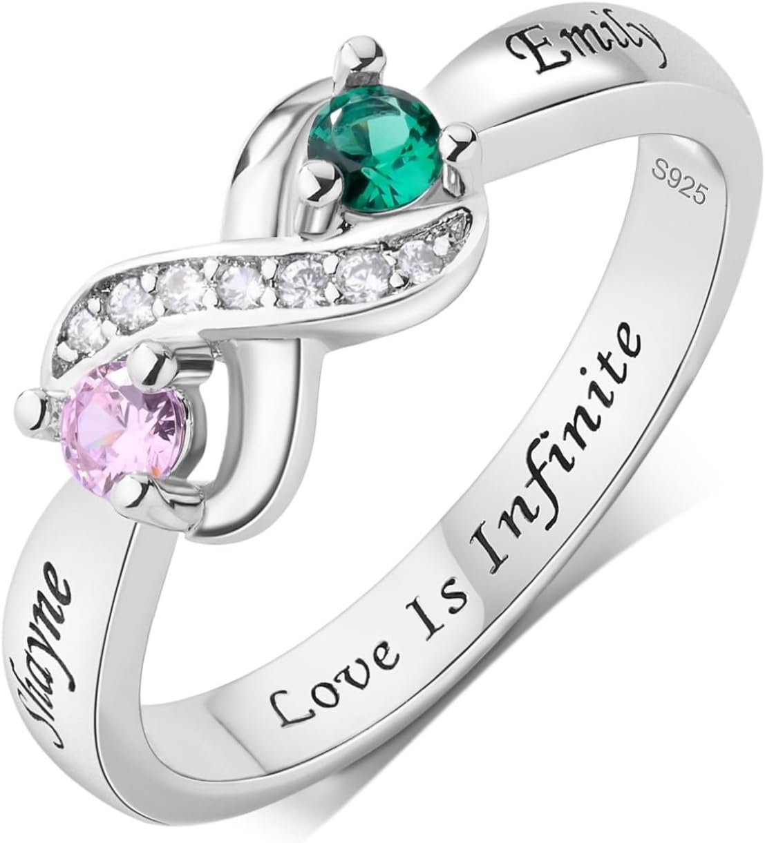 925 Sterling Silver Infinity Birthstone Ring – The Perfect Gift for Mom Crafted from premium 925 sterling silver for lasting shine and durability, this infinity ring is a heartfelt tribute to endless love—ideal for Mom (or your beloved, wife). The iconic infinity design symbolizes unbreakable bonds: two shimmering birthstones (one for her, one for you) represent your irreplaceable connection. Personalize with an engraving (name, date, or "I Love You Mom") for a touch that feels uniquely hers. More than jewelry, it’s a wearable reminder of your gratitude—timeless, meaningful, and made to honor the woman who loves you unconditionally. A perfect gift to say "thank you" for her endless devotion.