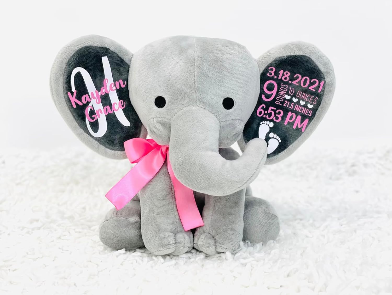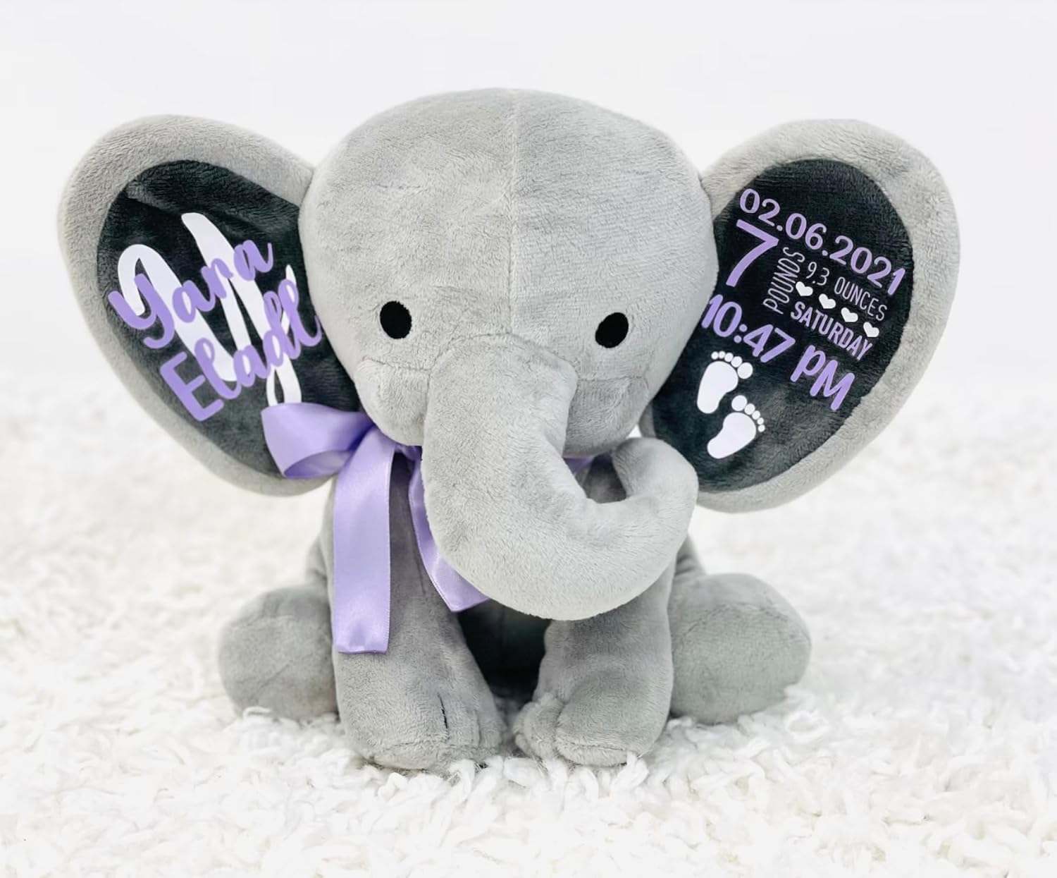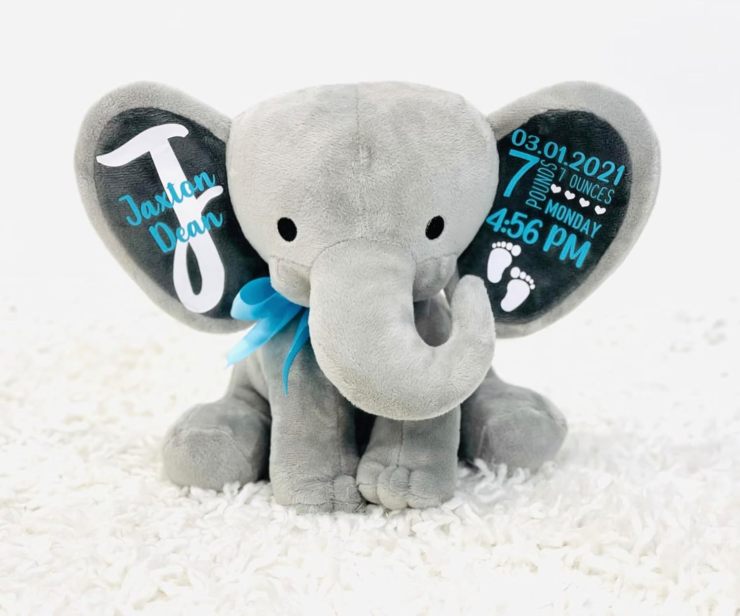 Welcome your little one with this adorable personalized plush elephant keepsake. Each elephant is customized with baby’s birth stats – making it a one-of-a-kind gift parents will treasure forever. Crafted with ultra-soft plush fabric - this elephant is the perfect nursery decor piece and keepsake for years to come. Ideal as a newborn gift, baby shower present, or hospital arrival surprise, it’s a heartfelt way to celebrate a new arrival.