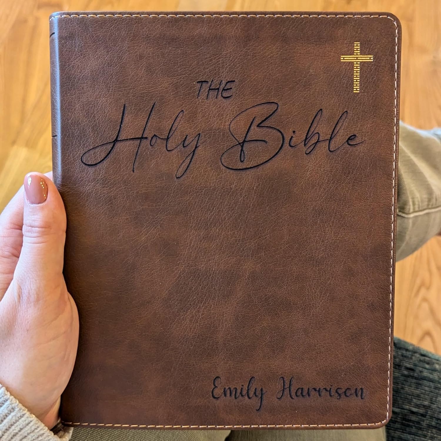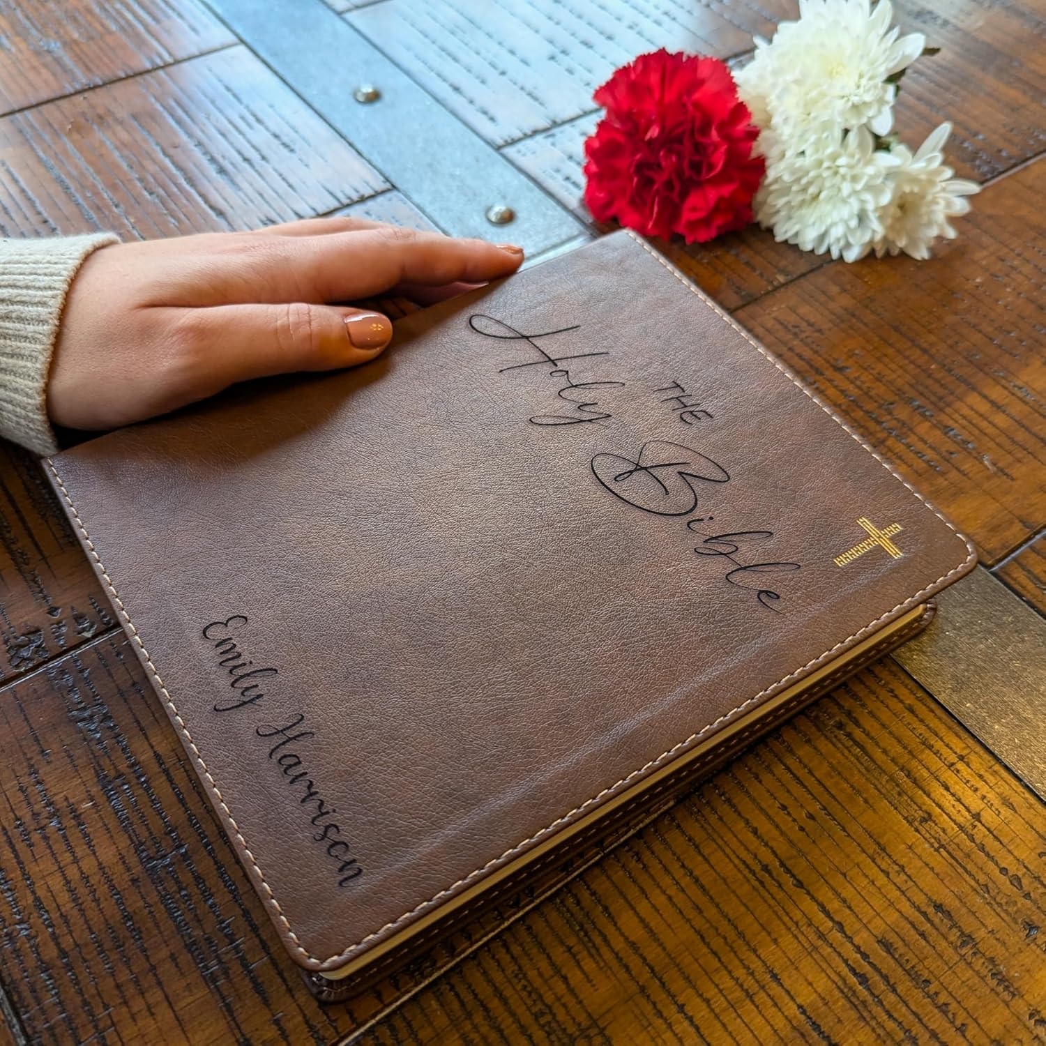 PERSONALIZED DESIGN: Make your Bible one of a kind. Custom engrave your name or a heartfelt message to create a meaningful keepsake that reflects your faith and devotion. CRAFTED TO PERFECTION: Our Bibles feature a beautifully engraved name on the leather-like cover, making each one truly personal. From the elegant exterior to the thick cream-colored pages that are easy on the eyes, every detail is designed to inspire. The easy-to-read double-column text and lightly lined wide margins for journaling make it perfect for reflecting on God’s Word and deepening your study. BIBLE FEATURES: New International Version (NIV) Journaling Bible custom laser-engraved with your name. Includes lined wide margins for notes and personal reflections with thick cream paper for enduring journaling. The double-column layout keeps it portable at just 8.5” x 7” x 1.5”. Features a satin ribbon marker, red-letter text for the words of Jesus, and a leather-like cover that lies flat when open. Printed in a comfortable 8-point font size for easy reading. PERFECT CHRISTIAN GIFT: A personalized Bible makes a thoughtful and meaningful gift for baptisms, birthdays, weddings, confirmations, or any special occasion. Cherished by men, women, and children alike, it’s a timeless expression of faith and love. WHY CHOOSE US?: We are a small, family-owned business dedicated to exceptional craftsmanship and friendly, fast service. Each Bible is engraved with care and shipped promptly, ensuring a thoughtful and personal gift experience every time.