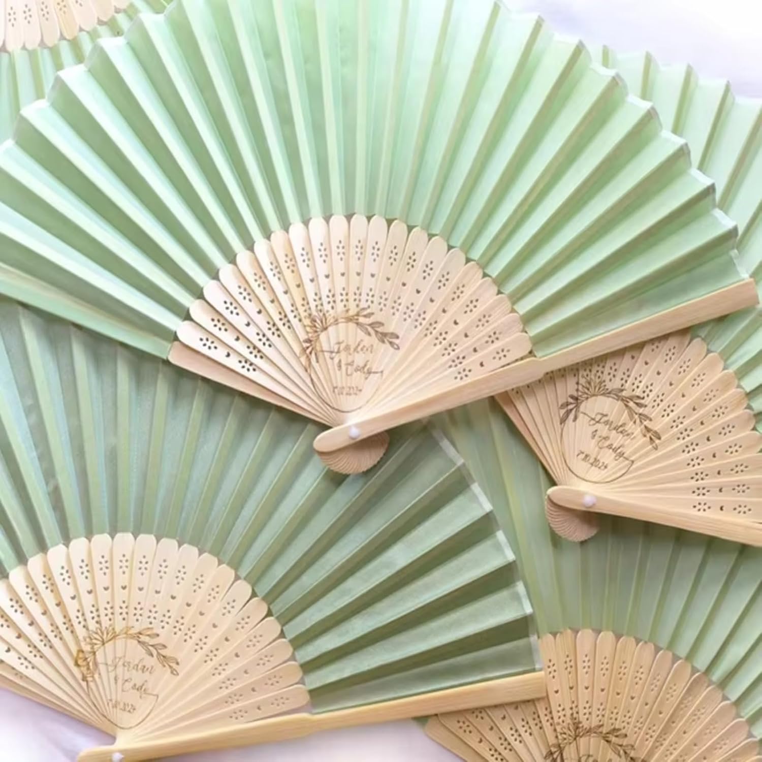 Handmade: The wedding flavor hand fan is made of natural bamboo, colored with classic white, and fabric fans. Each piece is handcrafted with great attention to detail. Each fan can be printed with your custom name or pattern, depending on your preference. Features: 1. Ideal for keeping cool, folding into small spaces, easy to carry 2. Suitable for weddings, residences, offices, stages, parties and festivals, bridal shower favor, baby shower,Christmas Gift 3. Customizable with laser engraving: Add a personal touch to your fan by having a special message, name, or design engraved with precision using our advanced laser technology. 4. Double-sided carving: open the handle and the side polished carving. Material: Silk and Bamboo Fan Dimensions: 21 cm (8.27 inches) when closed. Lightweight and foldable: It fits nicely in a handbag when closed, and takes it out to get more air when it's too hot, making it easy to carry in everyday life. Occasion: These fans are great rustic wedding party favors and home decorations, music concert souvenirs, perfect for summer garden outdoor occasions, school grad gifts, outdoor beach weddings, elegant garden tea parties, birthday parties, Quinceanera Fans, baby shower gifts, bachelorette party photoshoots, travel, camping, real estate summer activities promotion, advertising campaign, restaurant, coffee shops, business gifts, hotel exhibition gifts, Christmas gifts, housewarming gifts ect.