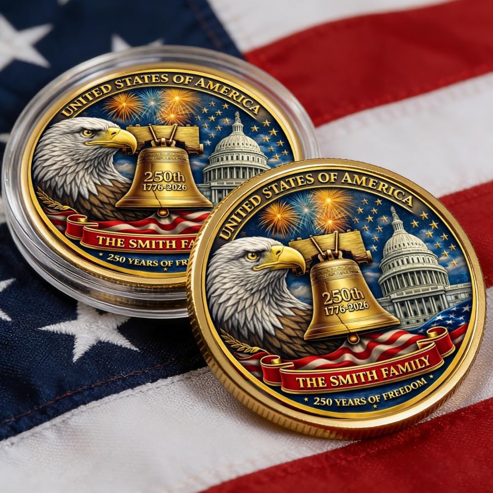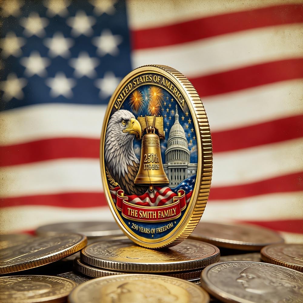 Commemorate a historic milestone in American history with this personalized USA 250th anniversary commemorative coin, created to celebrate the Semiquincentennial of the United States from 1776–2026. This striking coin design features iconic American symbols including the Liberty Bell, the U.S. Capitol, a majestic eagle, and vibrant fireworks set against the American flag. Together, these powerful elements represent freedom, resilience, and the enduring spirit of the nation after two and a half centuries of independence. The bold “250th 1776–2026” engraving and “250 Years of Freedom” message make this coin a meaningful tribute to the once-in-a-generation celebration of American heritage. What makes this commemorative coin truly special is the ability to personalize it with your family name, a meaningful message, an established year, or even a custom photo. This customization transforms the coin into a unique keepsake that celebrates both national pride and your own family legacy. Whether displayed in a coin collection, presented in a display case, or kept as a treasured family memento, this custom America's 250 coin becomes a timeless reminder of patriotism and history. Designed especially for proud Americans, collectors, veterans, military families, and history enthusiasts, this commemorative coin is perfect for celebrating Independence Day, Memorial Day, Veterans Day, and the historic 2026 Semiquincentennial event. The detailed engraving, patriotic colors, and iconic American imagery give this coin a premium collector aesthetic that stands out beautifully in display cases, desks, or commemorative collections. It also makes a meaningful patriotic gift for friends, family members, veterans, and collectors who want to honor the legacy of American freedom. Celebrate 250 years of independence with a personalized coin that symbolizes unity, pride, and the enduring American spirit.