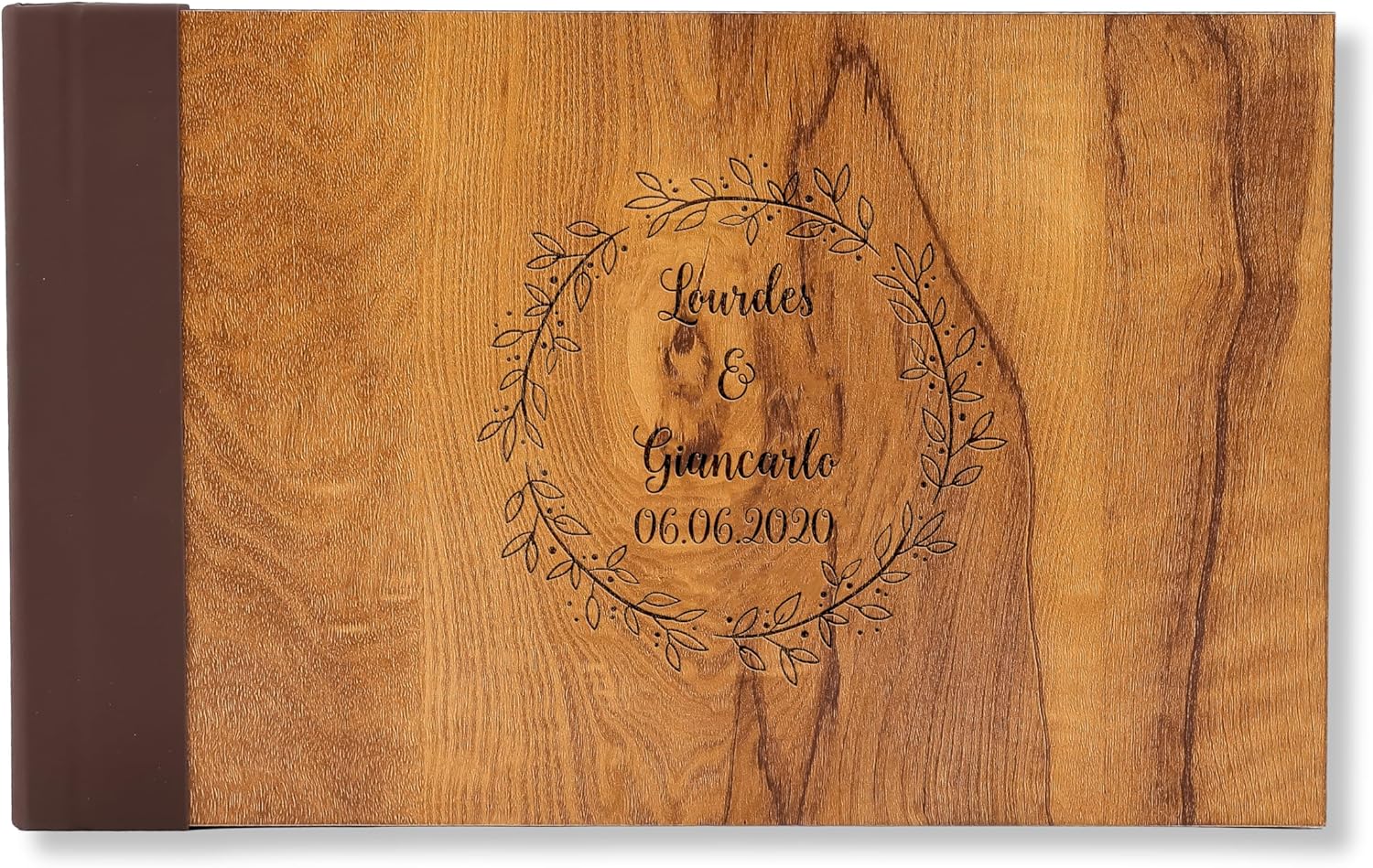 Cherish your most special day with this uniquely beautiful and customizable wooden guest book. Handcrafted with love, this personalized keepsake features hand-painted designs and custom engraving, allowing you to immortalize your names, surnames, and the date on the cover. Measuring 11 in x 8.5 in, it has 40 pages and a sturdy wooden front and back cover, ensuring your precious memories are preserved for years to come. Personalize it to your heart's content and create a truly one-of-a-kind memento that will transport you back to your special day every time you flip through its pages.