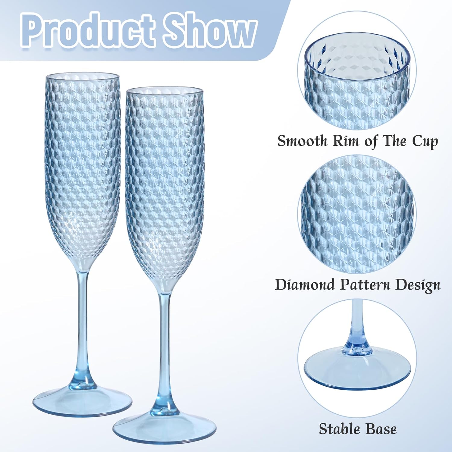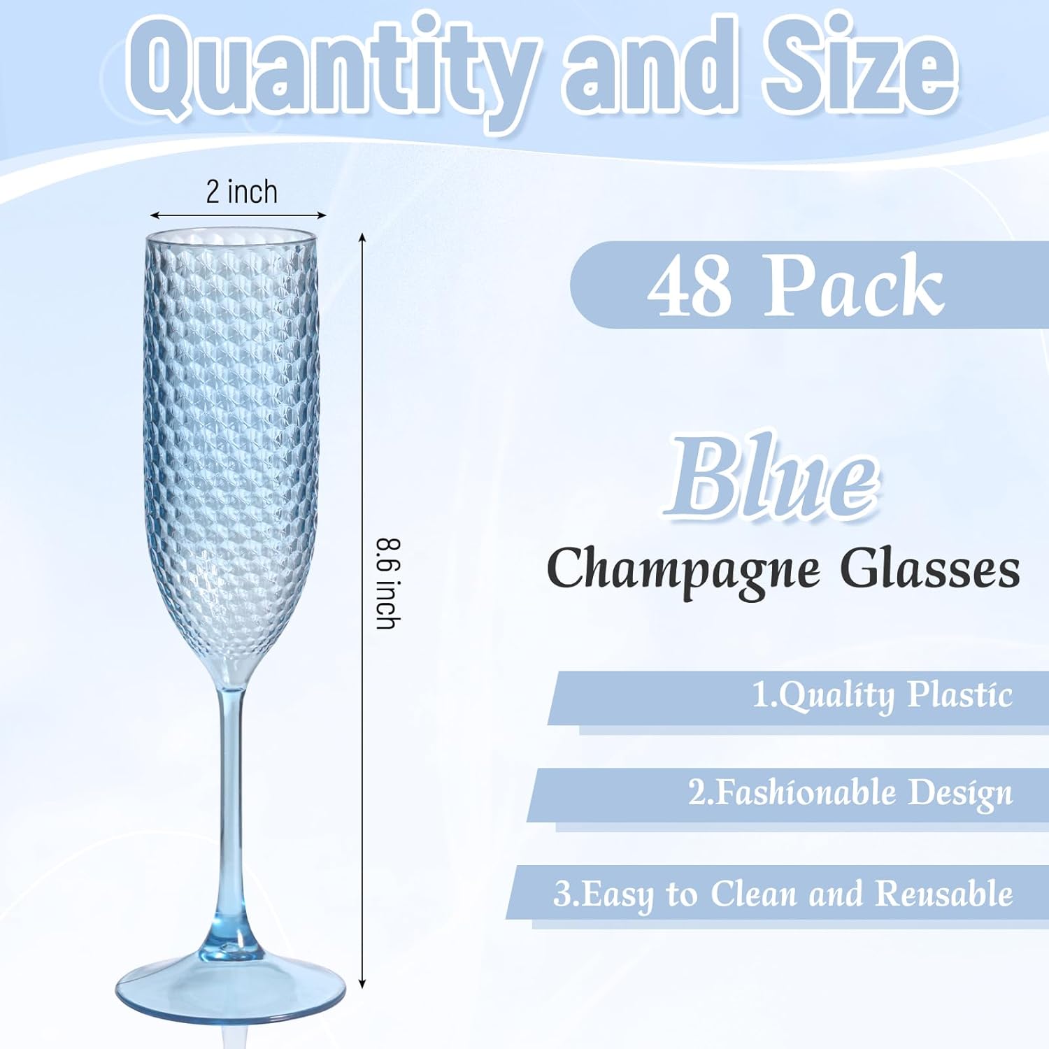 Product DescriptionFeature:This Diamond Wine Cups is exquisitely designed, featuring a diamond pattern style that looks crystal clear, fashionable and romantic. It is suitable for use in many events, such as parties, birthday parties, weddings, family dinners, and holiday celebrations. Using Vintage Drinking Glasses will create a great atmosphere for your event, and we believe it will leave you with beautiful and unique memories.These Plastic Champagne Glasses are not easily broken and are made of healthy and safe materials, so you don't have to worry about getting hurt by breaking the glass. And they are delicate, easy to clean, reusable, and convenient to store after use, without taking up a lot of space. Of course, you can also use it as a disposable item. The high footed diamond wine glass will bring you a romantic activity experience.Specification:Material: PlasticColor: BluePackage includes: 48 Pack Blue Reusable Diamond Crystal Clear Wine GlassesDimensions: 7 ouncesOur Service:24 hours online customer serviceIf you have any unsatisfactory experience, we will serve you and help you solve the problem well.Notes:Due to manual measurement, allow for slight dimensional deviations that may inevitably existThe colors may vary slightly due to lights and screen displays.