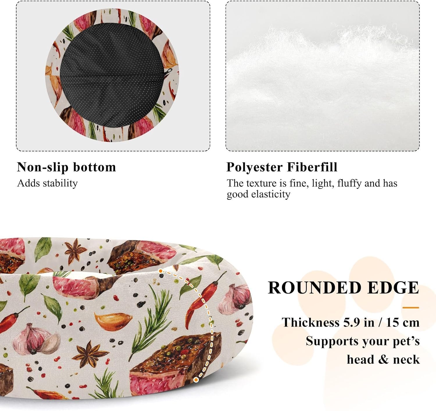 Material: Polyester + Filled Fiber + Drip Plastic. Our Dog Pillow Bed features a donut-shaped appearance design and is filled with silk-like cotton inside. It has excellent elasticity and fluffiness, providing comfortable support for pets and relieving joint pressure.Product Design: The overall shape is circular, with a concave middle part and a raised edge part. It can be used for pets to curl up and lean on, preventing them from rolling down while sleeping to gain a sense of security. Dog Pillow Bed is very suitable for young and elderly pets.Applicable Scenarios: This comfortable bed can be used by pets such as cats and dogs. Dog Pillow Bed can be used in scenarios such as living rooms, floors, sofas, cages, and cars.Washing Instructions: Hand wash or machine wash. Air dry in the shade. Please use a mild neutral detergent.