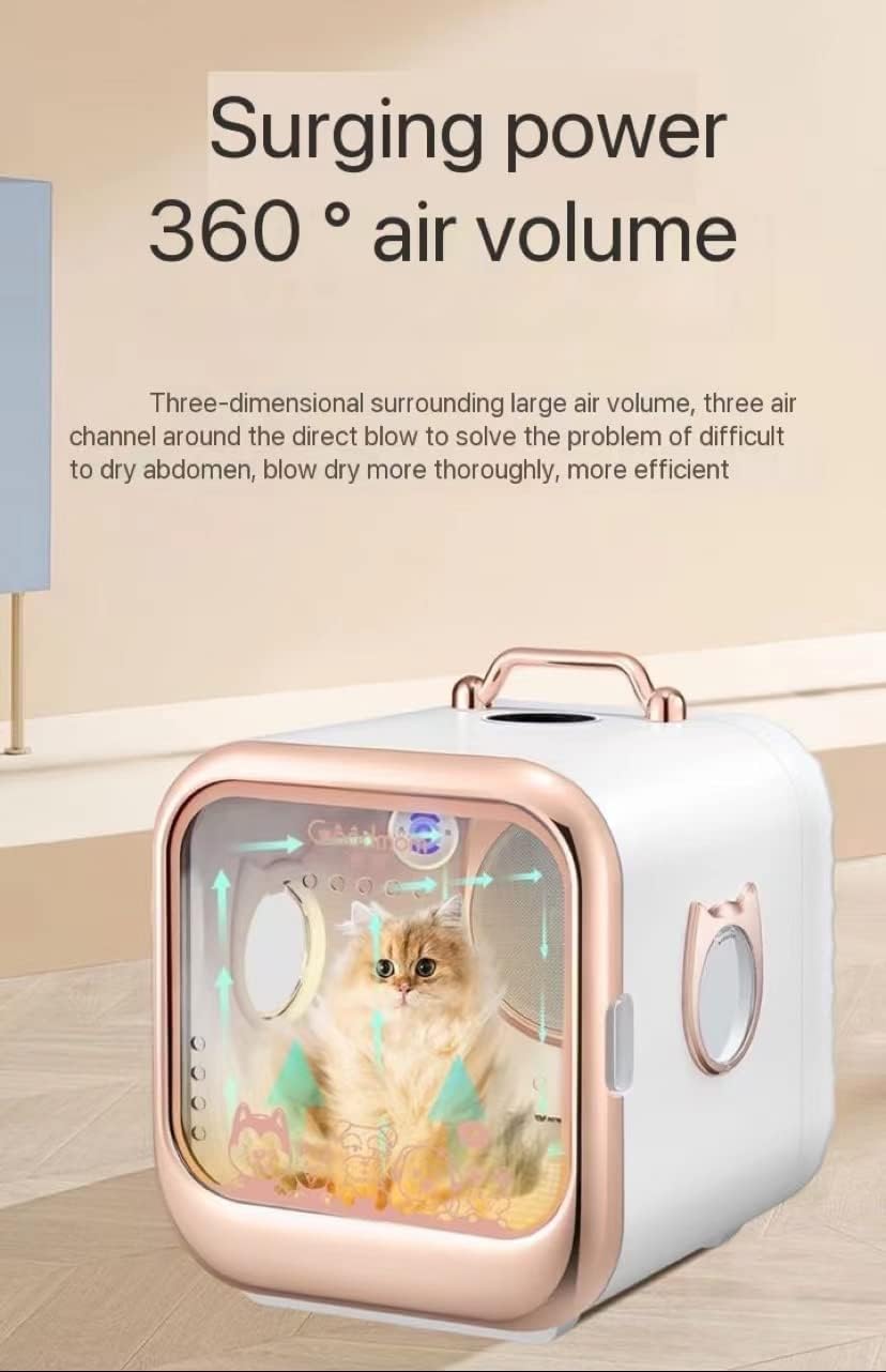 ABS bottom plate, detachable and easy to clean Rose gold nickel-plated texture handle, foldable and easy to move, easy to carry and carry Product parameters: Specification: Material: ABS Product name: Pet blow dryer Applicable pets: cats, small and medium-sized dogs Power: 2000W Capacity: 63L Rated voltage: 220V-50HZ Temperature control: seven gear Operating noise:≤50Db Net weight: 15kg Heating temperature: 20-40℃ Product size:Internal size:360*430*400mm,External dimensions:530*443*500mm Product List: 1*Pet blow dryer