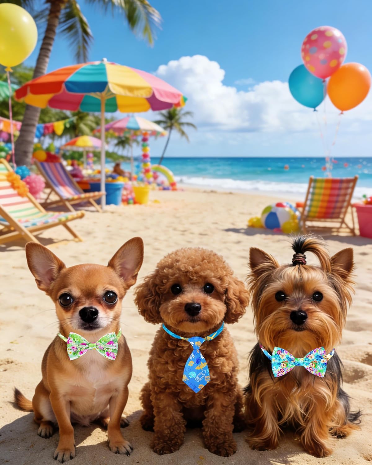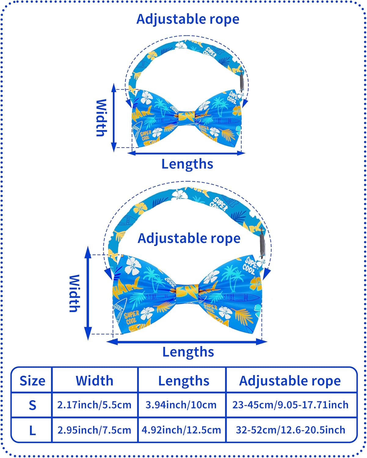Cute giftMaterial: polyester & elastic rubberBow tie size:S: Bowties- 3.94*2.17 inch, Neck ties- 1.57*4.72inch; L: Bowties- 4.92*2.95 inch, Neck ties-2.2*10.6 inches; Adjustable neckline: S: Bow ties- from 23cm/9.05inch to 45cm/17.71inch; Neck ties-from 25cm/9.84inch to 45/17.71inch;L: Bow ties-- from 32cm/12.6inch to 52cm/20.47inch; Neck ties- from 36cm/14.2inch to 63cm/24.8inchStyles: 30 different Hawaii designsQTY: 60pcs/pack; 30pcs dog hawaiian bowties and 30pcs necktiesOccasions: suitable for daily life, beach party, holiday, photograph etc.