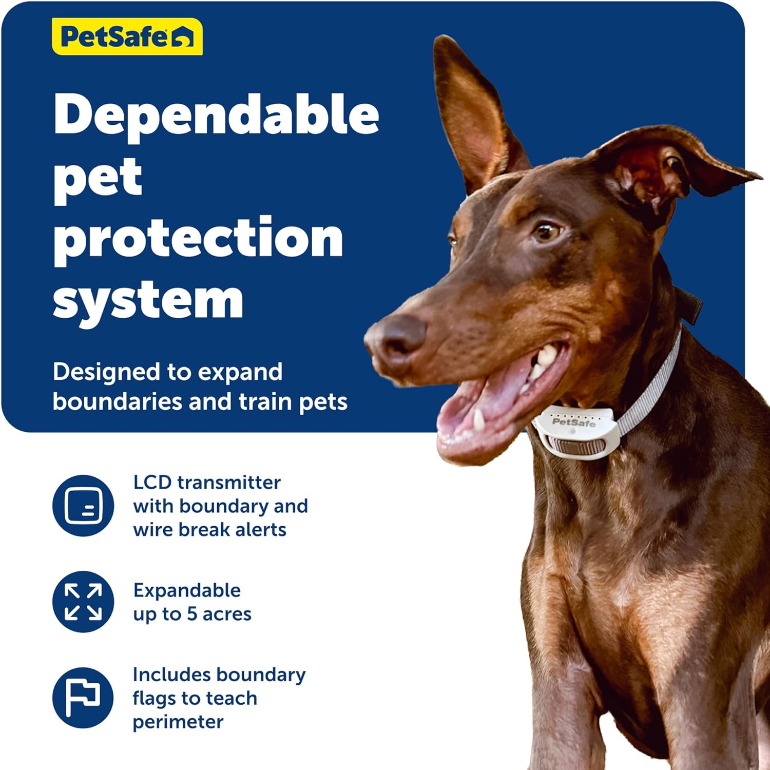 Give your dog the freedom to roam safely with the PetSafe Classic In-Ground Fence System. Designed for customizable containment, this flexible pet fencing solution is perfect for rectangular or uniquely shaped yards. The system includes 500 feet of wire, providing coverage for up to 1/3 acre, and can be expanded up to 5 acres with additional wire (sold separately), giving you complete control over your dog’s play area. The system comes with a waterproof, rechargeable receiver collar that fits dogs 5 pounds and up. Setup is a weekend DIY project, and the included indoor transmitter features an easy-to-read LCD screen that displays boundary distance settings and alerts you to wire breaks. This electric fence is more than just an outdoor barrier—it’s a long-lasting system that adapts to your training preferences. The included visual cue boundary flags help your dog learn the limits of their play area during the training period. Plus, the receiver collar is compatible with PetSafe Pawz Away Indoor and Outdoor Barriers, making it ideal for reinforcing good habits both inside and outside your home. Since 1988, PetSafe has been driven by a simple belief: safe, healthy pets lead to happier lives for pets and their families. For over 25 years, we've been dedicated to enhancing the lives of pets and the people who love them, treating every pet as a cherished family member and delivering life-changing innovations designed to enrich every moment. With U.S. roots and a global reach, our vet- and trainer-recommended products are built for every pet and backed by exceptional customer support. From backyards to dog parks, we're on a mission to create fields of joy for happy, healthy, and safe pets.
