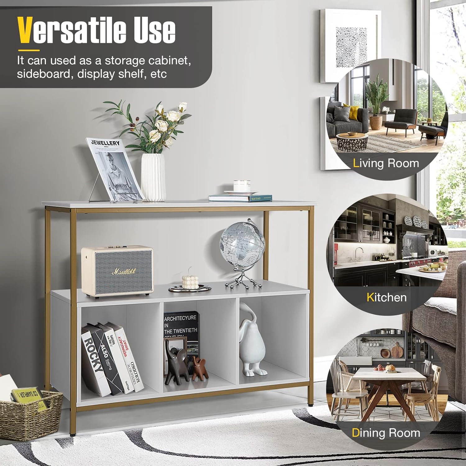 Description: Our buffet server sideboard would be one of the appropriate choice for you. Not only does it have a unique appearance that consists of sleek lines and modern design, but also the cupboard provides sufficient storage space for various kinds of kitchen supplies. In addition, the heavy-duty steel frame with reinforced connection is so strong that enables the kitchen storage cabinet to hold a total weight of 462 lbs. This versatile sideboard is a practical and great addition for your dining room, kitchen and living room, which features superior durability and practical use. Features: Wide cabinet top and large shelf are convenient to access 3 open compartments provide ample classified space for kitchen supplies Powder-coated steel frame features rustproof and great sturdiness Adjustable foot pads at the bottom take the stability to a higher level Simple and modern design perfectly coordinates with any room style Work great as a cupboard, buffet sideboard, and display shelf, etc Suitable for living room, dining room, kitchen and restaurant, etc Smooth surface is easy to clean and maintain Easy to assemble under the guidance of detailed instruction Specifications: Color: Brown, Black, White Material:Engineered Wood, MDF, Steel Product Dimensions:43.5 x 17 x 35 inch (L x W x H) Net Weight: 58.5 lbs