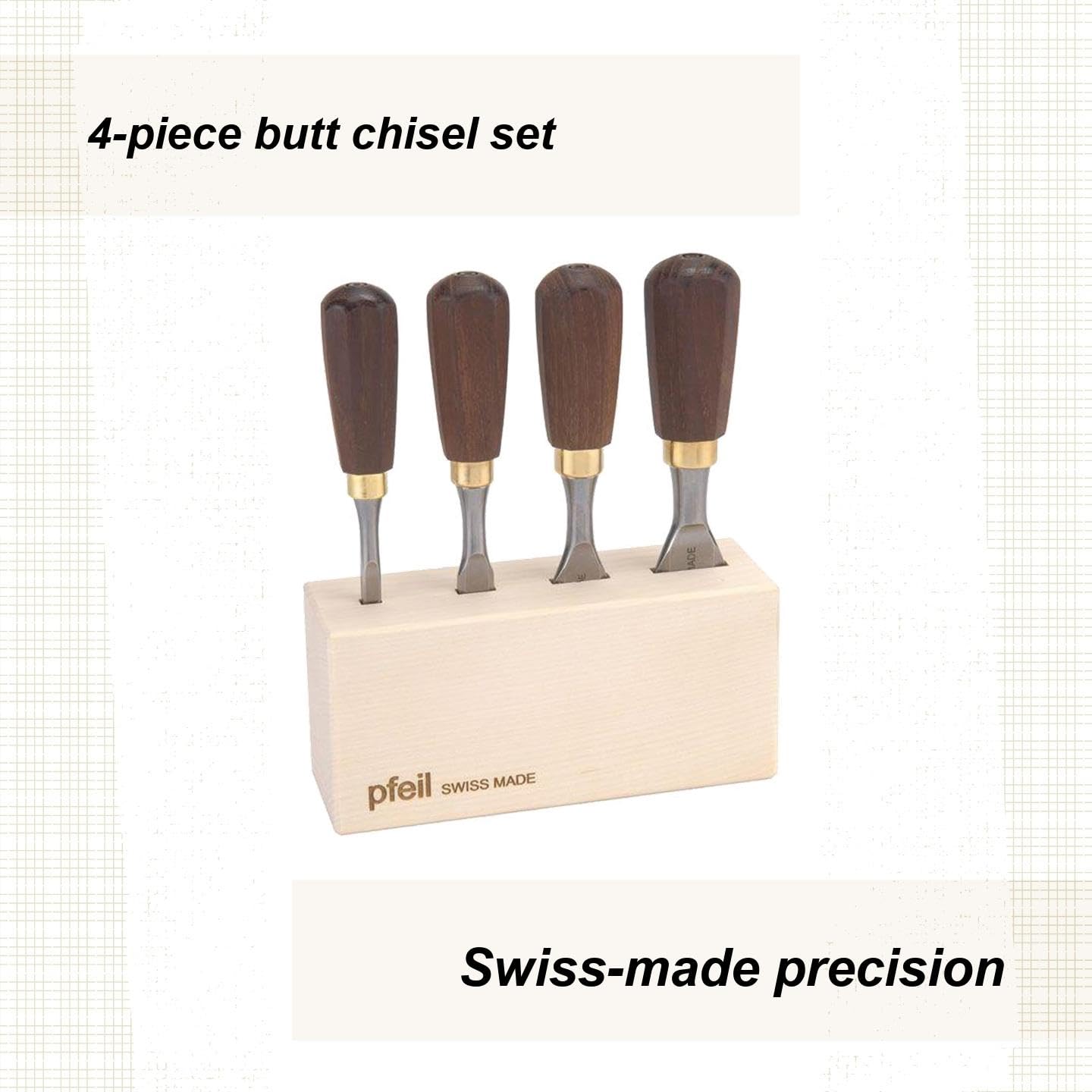 pfeil butt chisels are easier and more controllable to use for joinery than full-sized bench chisels. When you're trying to hold your chisel exactly on a line and perfectly vertical while you strike it, you will love using these shorter chisels. Faceted, contoured European locust handles fit the hand comfortably but prevent the chisels from rolling off your bench. Blades are made of Swiss alloy tool steel and heat treated using the latest technology for excellent edge holding. Chisels are ground and polished from the maker. Overall length is 6". Blade length 3-3/8". Chisel is 6mm, approximately 1/4" wide. This 4-piece set includes 6mm (1/4"), 12mm (1/2"), 19mm (3/4"), and 25mm (1") wide chisels and includes a fitted wooden block to safely store and protect your chisels when not in use.