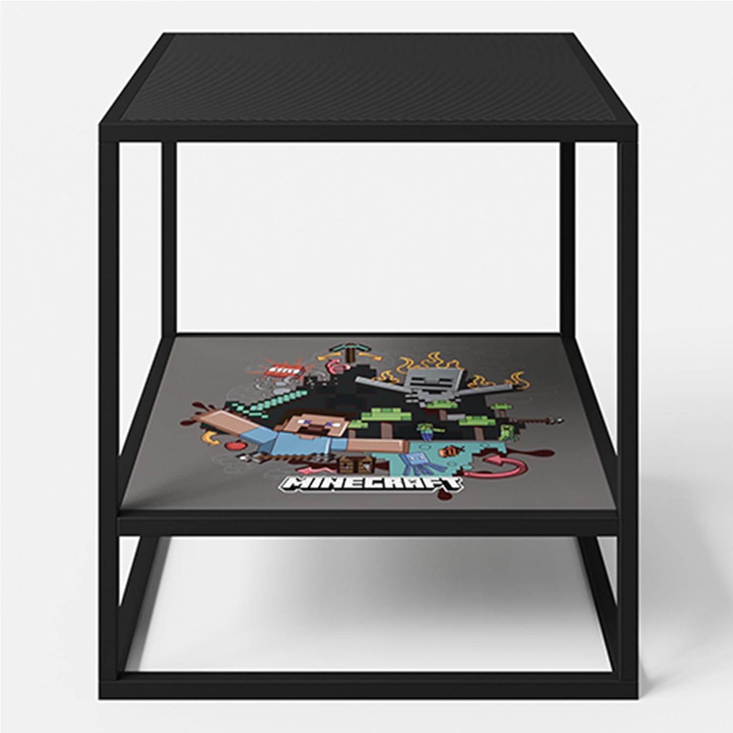 The MINECRAFT Side Table/Nightstand with Storage Shelf is a versatile and stylish addition to any room. Measuring 17.7 x 18.9 x 17.7 inches (45x48x45 cm), this multifunctional piece can serve as a side table, bedside table, gaming area, or coffee table. The removable table top, which doubles as a tray, adds convenience and flexibility to its use. Crafted from durable particle board and easy-care metal, this table features a colorful MINECRAFT print on the tabletop, bringing a playful and vibrant touch to any space. The integrated storage shelf provides additional space for organizing books, decor, or other essentials, making it both functional and fun.