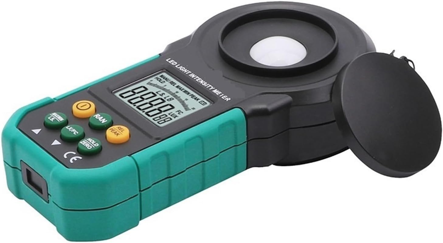 Measuring all light produced by all visible color of LED, fluorescent lamp, metal-halide lamp, high voltage sodium lamp or electric incandescent lamp. Measuring range is up to : 0.00~200000 Lux / 020000 FCBuilt-in high precision photo diode sensor and color correction filter for indoor useBoth digits and analog bargraph displayAutoandmanualrangeRelativeandpeak valuemeasurementUser Friendly functionsMax./Min. value display, Low battery indication,Lux/FC unit, Auto power off,Backlight,Data hold, Zero calibrationSpecificationsRange20,200,2000,20000 FCRing spectral range:320~730nmAccuracy:±3% (calibrated to standard incandescent lamp and LED at 2,854K)±6% (calibrated at other visible light source)Applications:For all visible light and LED white, red,yellow, green, blue, purpleUnit selection:Lux.FC (Footcandles)Sensor:Silicon photodiodeSampling time:2 times/sec.Auto power off:10 min after no useOperation sound:Selection<;7VOperation environment:0~85%RH,-1050°C(no condense)Storage environment:0~70%RH,-1050°C(no condense)Operating altitude:Max. 2000mPower source:9V (included)Weight:154 g (not including battery)Dimension:170x85x45mmAccessory:Storage bag,instruction manual