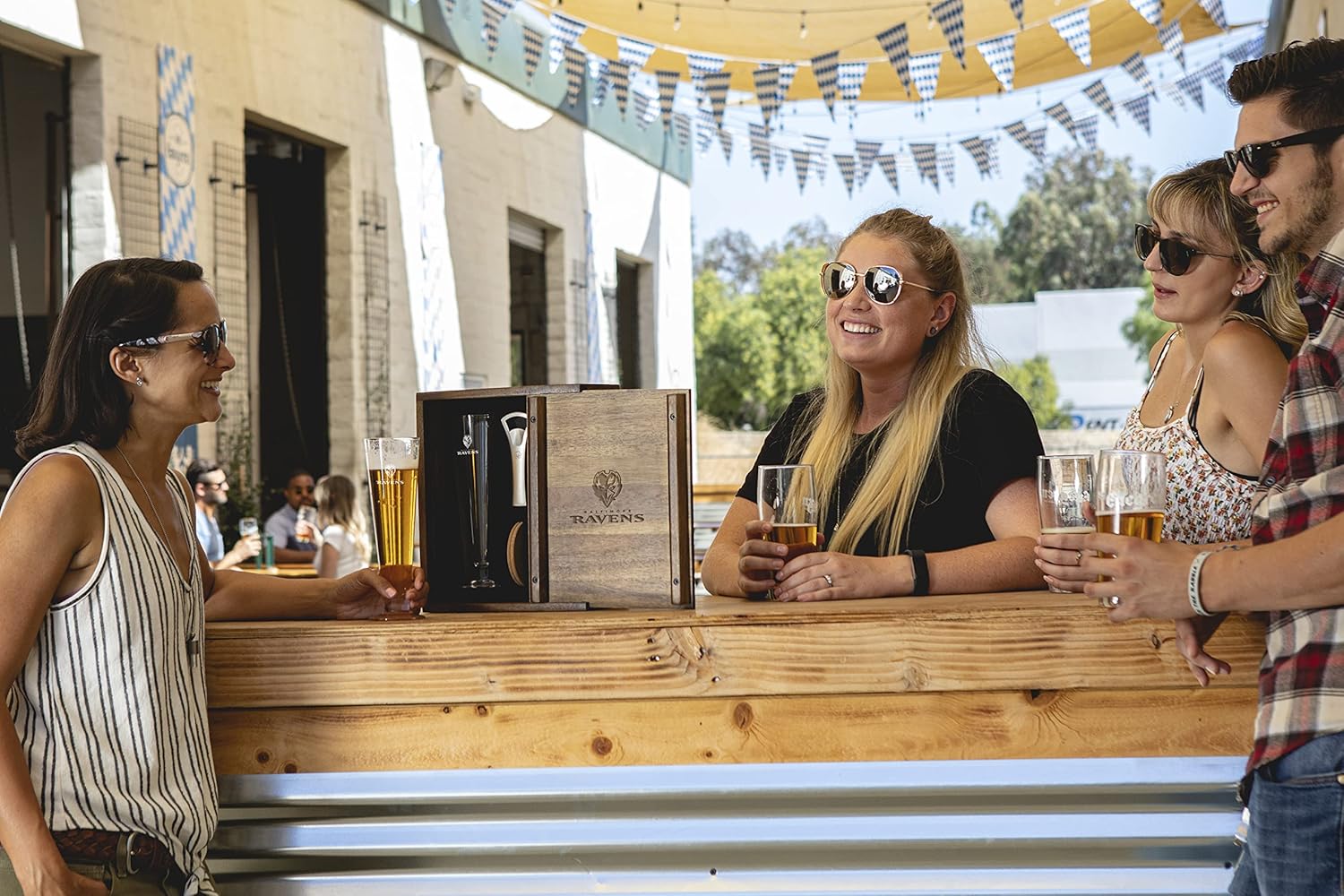This NFL Picnic Time Pilsner glass gift set features a stunning, solid acacia wood presentation box with dovetail joinery and a sliding, removable panel door with your favorite team's laser-engraved logo. Glide the lid open to reveal a rich interior with form fitted grooves that hold the accessories in place. The two 12-ounce pilsner glasses steal the show, with their conical shape, weighted shams and footed bases. This beer glass shape is recognized internationally as a fine complement to both pale lagers and pilsners, as the slender shape reveals the color and carbonation of the beer, while the broad top helps to maintain a foamy head. Also included in this gift set is a steel bottle opener, and two round natural cork coasters. Our NFL Pilsner gift set will make an amazing gift for dads, grads, birthdays, housewarming, or many other special occasions. Measures 12 by 10 by 5.3 inches, and comes with Picnic Time's Lifetime Warranty.