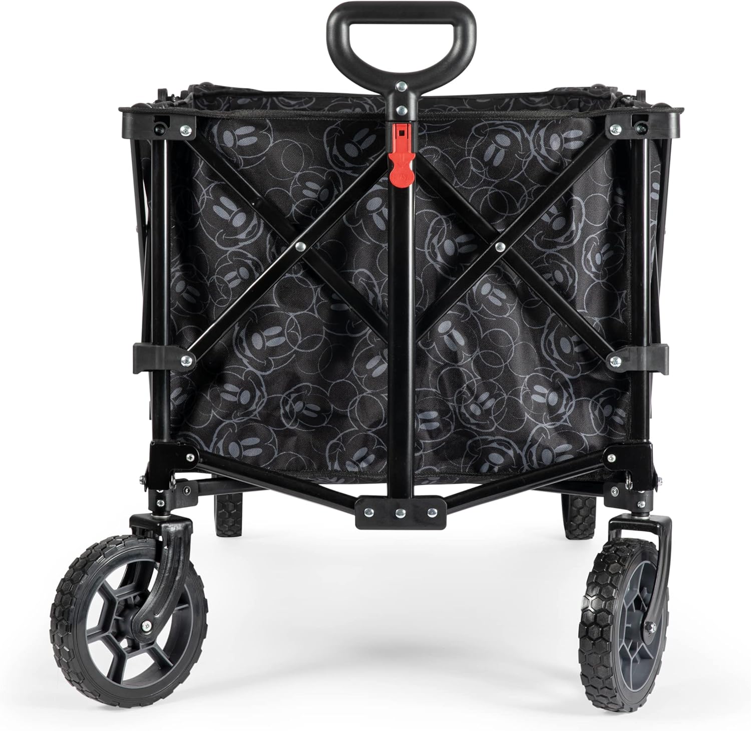 Upgrade the way you haul with the Mickey Mouse Adventure Wagon XL, a deluxe folding utility wagon that brings Disney style and everyday practicality together in one smooth ride. Designed to move gear effortlessly, this spacious outdoor wagon is perfect for beach days, park trips, camping weekends, outdoor events, and shopping runs. Built on a sturdy steel frame with large all terrain wheels, this folding wagon rolls smoothly across sand, grass, pavement, and packed trails. The spring loaded telescopic handle stays upright when released, making steering comfortable and controlled wherever the day takes you. When it’s time to pack up, the wagon folds down quickly and stores neatly in its included fitted cover with carry handle. No tools, no assembly, no hassle. Simply unfold and go when adventure calls. With a generous interior measuring 35.5 by 19 by 22 inches and a weight capacity of up to 110 pounds, this XL utility wagon easily handles coolers, picnic supplies, sports gear, groceries, and more. Finished in classic black with understated Mickey Mouse detailing, it’s a stylish, dependable wagon that’s always ready to roll.