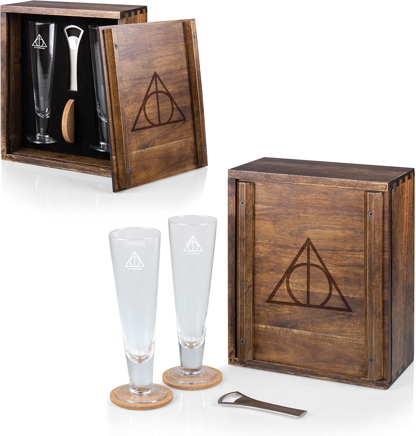 Channel legendary wizarding lore into every sip with this Deathly Hallows Drinking Glasses Gift Set inspired by the world of Harry Potter. Designed to merge iconic symbolism with everyday function, this collectible drinkware set transforms simple pours into meaningful moments. At the heart of the set are two tall 12-ounce fluted beverage glasses, each engraved with the instantly recognizable Deathly Hallows emblem. Perfect for cocktails, sparkling drinks, or everyday refreshments, these glasses add visual intrigue and ceremonial flair to any occasion. The set is housed in a beautifully crafted acacia wood presentation box, built with precision dovetail joinery and a smooth sliding door. Rich wood tones and clean lines create a striking display that looks just as impressive on a countertop or bar top as it does opened for use. Inside, a form-fitted interior keeps every component securely in place, including a sturdy stainless steel bottle opener and two natural cork coasters. Each accessory complements the glassware while enhancing the ritual of serving drinks with intention and style. Perfect for celebrations, themed gatherings, or gifting to devoted fans, this Deathly Hallows beverage set blends craftsmanship, symbolism, and timeless appeal into one unforgettable keepsake that’s always ready to raise a glass.