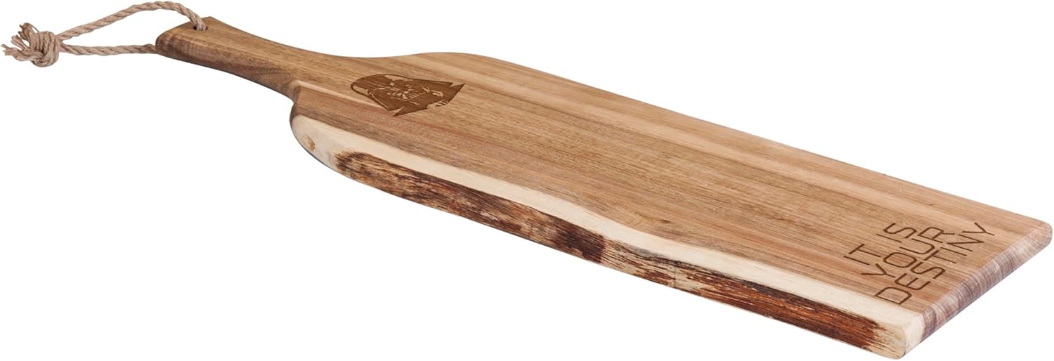 The Lucas/Star Wars Darth Vader Artisan serving plank Picnic Time will be a gorgeous addition to your serve ware collection. This paddle shaped serving plank is made with beautiful wood from the acacia tree. To showcase this naturally water-resistant wood, we've left some of its raw beauty intact by featuring a live edge on one side, rendering a unique look and ensuring that none of these planks are exactly alike. You'll love the laser engraved Darth Vader artwork on the face, along with the phrase "It is Your Destiny". Adding to its rustic look, the handle includes a hemp hanging loop, allowing you to display this versatile piece of kitchen art for your guests to appreciate. Great for serving appetizers, rustic bread, crudite, or cheese and crackers, the Artisan will wow your guests. The Artisan measures 24 by 8 by 3/4 inches, and is backed by the Picnic Time Family of Brands BUILT TO LAST Lifetime Guarantee.
