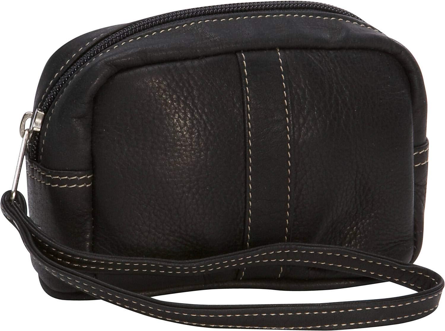 Top-zip opening to lined main compartment. Wrist strap for easy carrying.