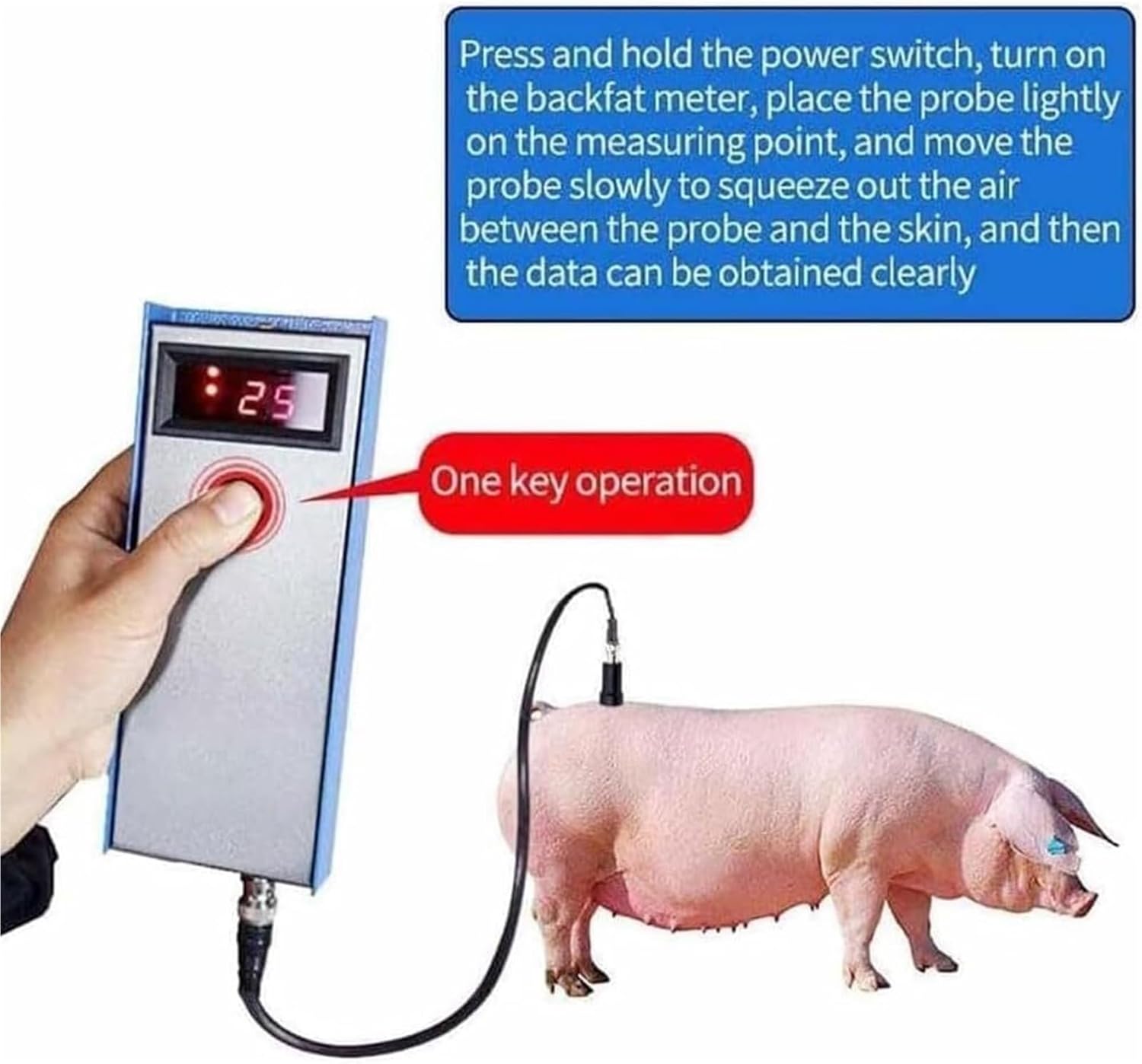 Description:This back fat thickness gauge is designed to measure the combined thickness of three layers of back fat in mammals. Its measurement scope spans from 4mm to 35mm, with an accuracy of plus or minus 1mm. Additionally, it can automatically detect and show the number of back - fat layers.Note: Please be aware that this testing device lacks waterproof capabilities and must not be submerged in water under any circumstances.Specification:Name: Pig Back Fat Measure TesterMeasuring range: 4-35mm±1mmWorking power supply: 6-10 hours in full working stateCharging time: 12-14 hoursSize: 18*7.5*2.8cmWeight: 340gUsage: Measure the thickness of back fat and thickness of pigs and other animalsApplication: Suitable for cows, sheep, pigs, and morePacking List:Pig Back Fat Measure Tester *1Probe *1Charger *1Notes:1. Please allow 1-5mm deviation due to manual measurement.2. Due to light and screen differences, the color of the item may be slightly different from the picture.
