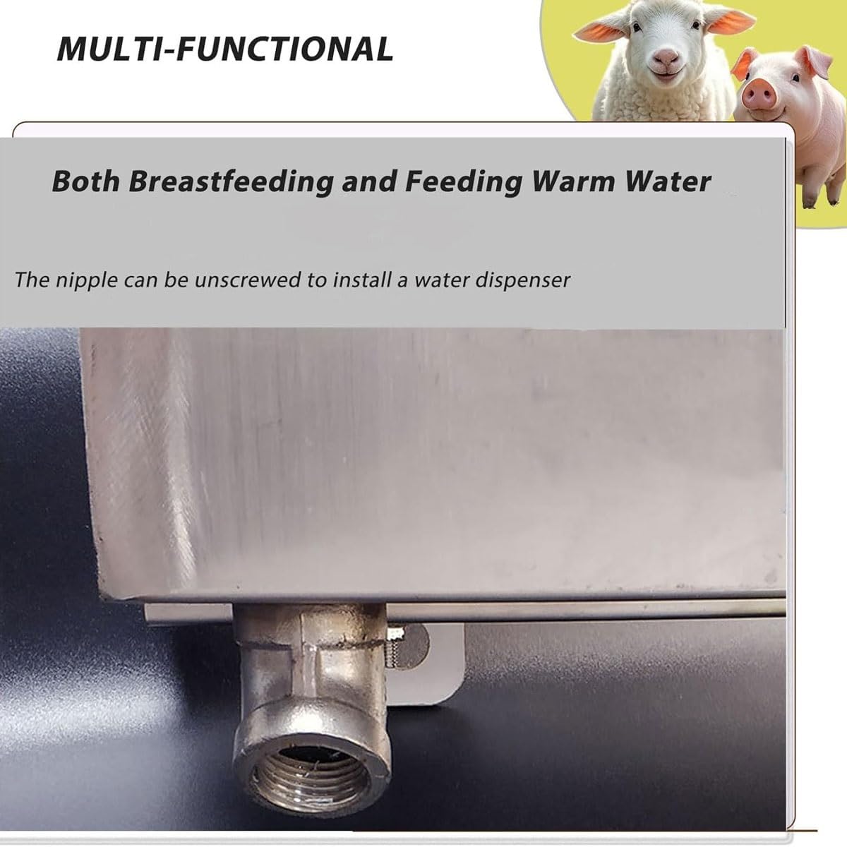 The intelligent constant temperature function keeps the milk at an optimal warm temperature, avoiding discomfort caused by too cold or too hot milk. What’s more, the sow/ewe sound simulation function helps young animals adapt to the feeder quickly, encouraging them to eat actively and reducing the stress of weaning or separation from their mothers.Features:The number of teats is sufficient, 6 teats on each side, which can accommodate 6 piglets;Automatic stirring system to prevent precipitation and fully absorb liquid nutrients;Sound source simulation can effectively summon piglets to eat, as carefully as a sow;Control panel, precise temperature controlSpecification:Name: Automatic Nipple FeedersBody material: stainless steelScope of application: Can be used to raise pigs and sheepUsage: Feeding milk and waterProduct model: 6 pacifiers on one side, vocal stylePackage Included:1 X Piglet feederNotes:1. Please allow the slight color difference caused by the shooting light and 1-3cm error due to manual measurement.2. If you have any questions please contact me and I will reply you within 24 hours