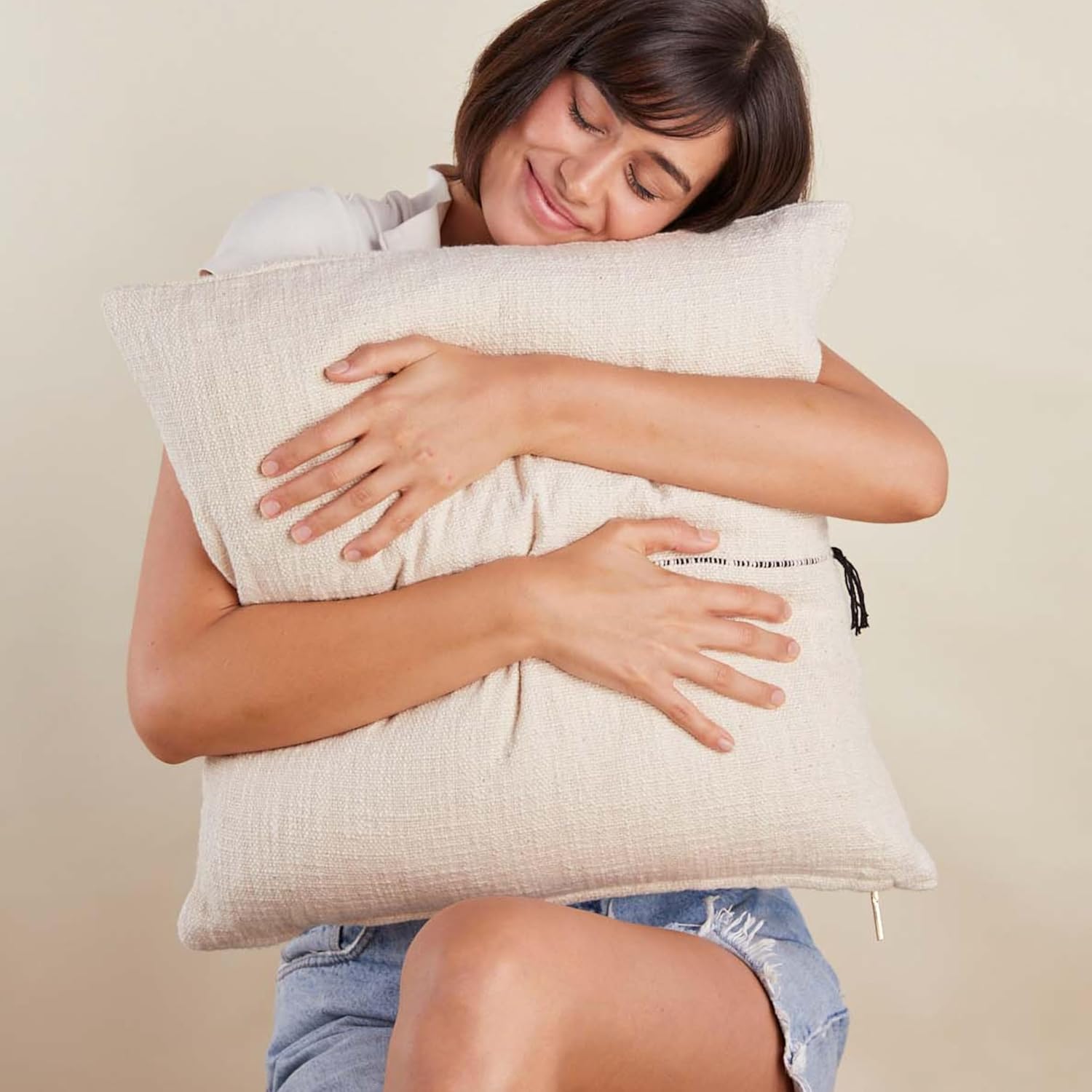 Elevate your home décor with the timeless elegance of the PILLOWPIA Minerva Pillow Cover. Crafted from 100% cotton, this high-quality decorative cushion cover offers a soft, breathable texture that complements any living space. Designed with a solid back, signature poppy tape, and a brass zipper with logo pull, it combines functionality with refined style. Measuring 20 x 20 inches, it is the perfect size for most standard square pillow inserts (sold separately). The neutral cream color blends seamlessly with a variety of décor themes—whether modern, farmhouse, bohemian, or classic. Ideal for enhancing your sofa, bed, or reading nook, it adds warmth and style to any room. For lasting beauty, simply spot clean with a mild detergent. Whether you’re refreshing your living room or adding a cozy accent to your bedroom, the PILLOWPIA Minerva Pillow Cover delivers a versatile, stylish solution for your home.