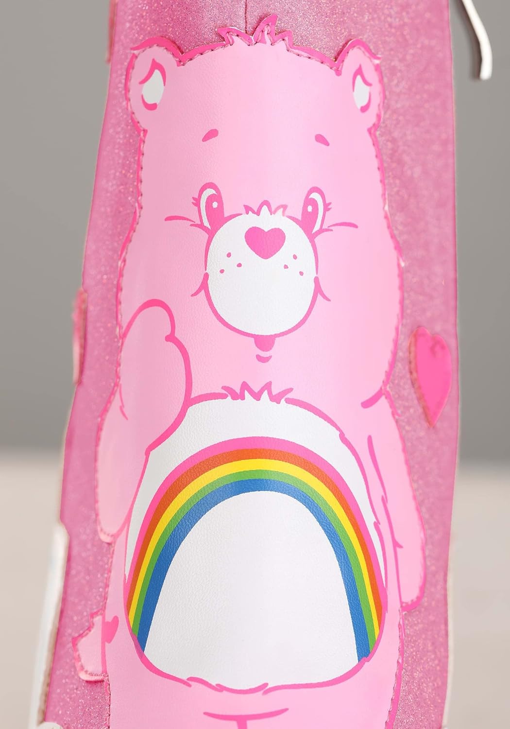 Pink Care Bears Cheer Bear Women's Ankle Boots Enter a world of nostalgia and charm with the Care Bears Cheer Bear Women's Ankle Boots. These delightful boots, inspired by the beloved character many have grown up with, are designed not just to appeal to your inner child but also to add a whimsical touch to your modern wardrobe. Made with a comfortable blend of 70% polyester and 30% cotton, these faux leather boots are both stylish and durable. Designed with care and attention to detail, each boot boasts a zipper on the inner side, ensuring ease of wear and a snug fit. The predominant pink style is beautifully complemented by the iconic Cheer Bear on the front. Its cheerful expression and iconic design evoke memories of the classic Care Bears series, seamlessly blending nostalgia with fashion. But the show-stealer is undoubtedly the rainbow-colored heel. This vibrant and unique feature stands out, ensuring that these boots make a statement wherever you go. The multicolored pattern not only pays homage to Cheer Bear's joyful nature and love for rainbows but also guarantees that these boots are a conversation starter. As an officially licensed Care Bears product, these ankle boots are a testament to authenticity and quality. Whether you're heading to a themed party, a casual day out, or simply want to infuse some fun into your outfit, the Care Bears Cheer Bear Women's Ankle Boots are the perfect choice for fans and fashion enthusiasts alike. Product Details: 70% polyester 30% cotton Faux leather pair of boots Zipper down the inner side of each boot Officially licensed Size Chart: 5: Foot Bed Length (heel to toe)=7 7/8"; Toe Width=3 1/4"; Boot Height=4"; Heel Height=3 1/4" 6: Foot Bed Length (heel to toe)=9"; Toe Width=3 1/4"; Boot Height=4"; Heel Height=3 1/2" 7: Foot Bed Length (heel to toe)=9 1/4"; Toe Width=3 1/2"; Boot Height=4 1/4"; Heel Height=3 1/2" 8: Foot Bed Length (heel to toe)=9 5/8"; Toe Width=3 3/4"; Boot Height=4 1/4"; Heel Height=3 1/2" 9: Foot Bed Leng