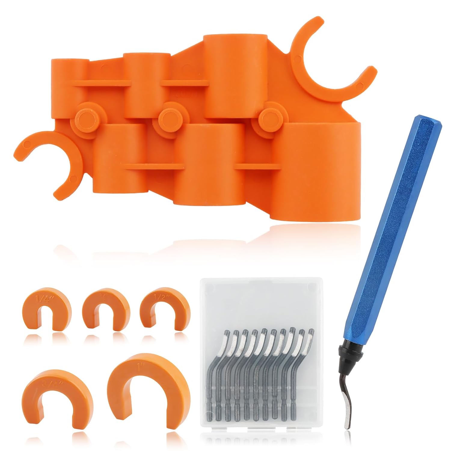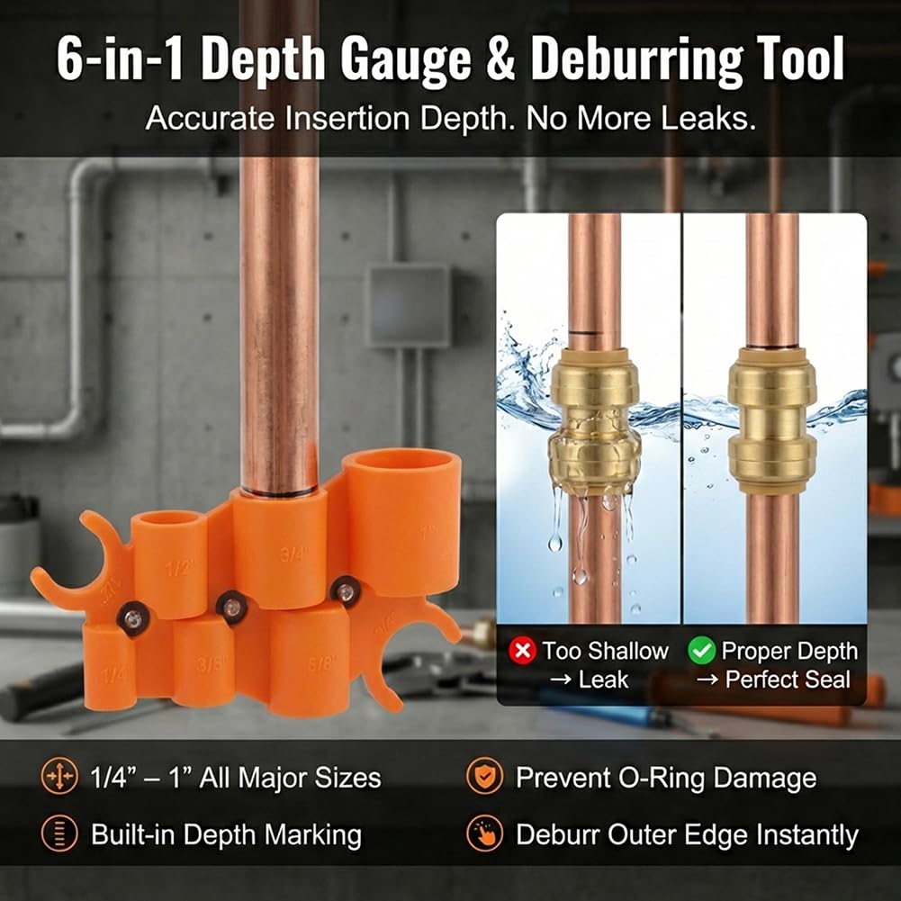 This Plumbing Tool Kit Combines a 12-in-1 Installation Set, a 6-in-1 Depth Gauge and Deburring Tool, and a 5-Piece Push-Fit Removal Tool Set to Help Install, Remove, and Prepare Pipes More Efficiently. Designed for Copper, PVC, PEX, PPR, and CPVC Pipes, It Supports Accurate Depth Measurement, Burr Removal, and Quick Fitting Release, Making It Suitable for Home Repairs, Plumbing Projects, HVAC Work, and Workshop Maintenance.Package includes: 5 x push-in disconnect tools, 1 x deburring tool, 10 x blades, 1 x pipe depth deburring tool