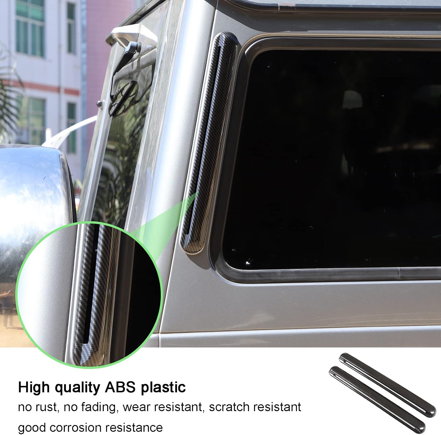 PIUGILH offers a wide range of accessories to enhance and upgrade both the look and function of your vehicle . We sincerely appreciate your decision to purchase our products, we always committed to providing the high-quality, safe automotive decorativeproducts and the excellent ,professional and customer service.Item Description:✨Fitment: for Mercedes Benz G Wagon W464 G Class W463 G500 G550 G63 G65 2004-2022Condition: 100% Brand NewMaterial: High quality of ABSColor:Black,Carbon Fiber PatternFeatures:❥Provides a high class and fashion decor style for your car, the conspicuous color brings you a good mood and fun of driving.❥The rear side window air vent decoration cover can cover existing scratches and prevent your car from scratch and abrasion./p> ❥Easy installation with Self-Adhesive tape on the back of the trim.❥Premium special double-side 3M tape will stick firmly and it will not cause damage to the car. No residue after take it off.🛠Installation method:Step1.Clean all positions with rubbing alcohol or water where will be covered in the rear side window air vent decoration cover. (Very important);Step2.After the alcohol or water is dry, remove the protective film from the Double-sided tape on the back of the product.Step3.Paste the accessories in the corresponding position and press it with your hand to make it more solid.📢Attention:Please ensure the part of your car like our picture shows, or it will not fit, if any differences, please contact with us before purchase, thanks!🎁Package Include:2pc / set PIUGILH rear side window air vent decoration coverPIUGILH have other universal interrior accessories,please browse our store in detail.You will find more automotive accessories to your satisfaction,thank you!