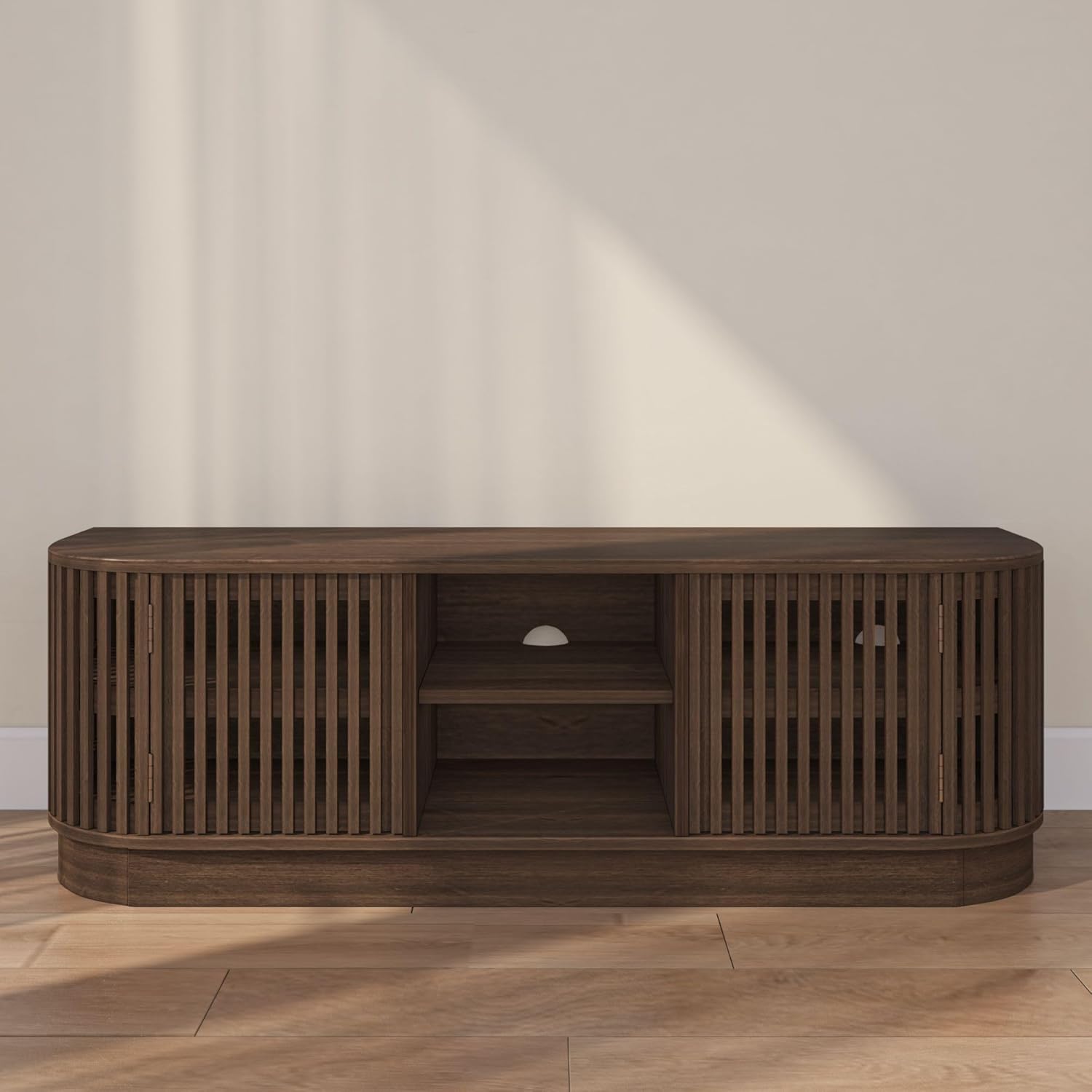 The Contour TV Stand from Plank+Beam adds both storage and style to any entertaining space. Crafted with knot-free, solid pine wood and engineered wood back panels, this modern media console table is built to withstand the wear and tear of everyday life. Its durable construction, complemented by clean, low-VOC finishes, ensures it’s both stylish and healthy for your space. Designed to fit TVs up to 65 inches, this modern TV stand cabinet makes the perfect centerpiece for any living room. Its two slatted doors not only make a style statement for your space but hide spacious storage for all your essentials. Its three built-in shelves adjust to three different heights, accommodating your storage needs and preferences. Its open middle shelf is the perfect place to show off all your favorite décor. This contemporary TV stand conveniently features cord cutouts for your cable box, gaming console, and more. Whether you're displaying decorative items, storing cable boxes and gaming consoles, or simply accentuating your living space, this media cabinet is designed to enhance the beauty and functionality of your home. Embrace style, durability, and versatility with the Contour TV Stand from Plank+Beam.
