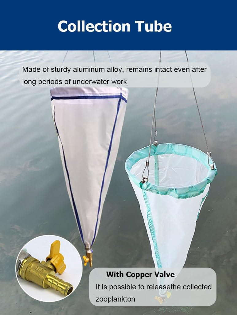 Are you in search of a reliable plankton collection net? Our high-quality plankton collection net makes gathering plankton quick and efficient, allowing you to fill a bottle in just a few minutes. This streamlined process not only saves time but also enhances the quality of your plankton samples, significantly boosting your research productivity. **Specifications:** - **Mesh Size:** 125/200 mesh - **Aperture Size:** 64/112 μm - **Net Length:** 23.62 in / 60 cm - **Net Diameter:** 11.8 in / 30 cm - **Net Material:** Special Nylon - **Net Ring Material:** Stainless Steel - **Bottom Collection Tube:** Space Aluminum - **Collection Tube Outlet:** Copper Valve **Key Features:** 1. **Rapid Collection:** Designed for quick and efficient plankton collection. 2. **Easy Release:** The bottom collection tube equipped with a copper valve allows for seamless release of collected zooplankton. 3. **Durable Design:** Features three sturdy lifting rings to prevent breakage during use. 4. **Marine-Grade Materials:** Built to withstand long-term exposure to seawater without damage. **Collection Method:** - Drag the net slowly through the water at a speed of 20-30 cm/s in a figure-eight motion for 1-3 minutes. Then, transfer the collected sample into a specimen bottle and use 4% formaldehyde to preserve it. - Alternatively, gather water samples at your desired depth using a sampler, and then use the plankton net to filter the sediment for concentrated liquid. **Note:** Choose different models of our plankton nets according to your specific collection needs. After each use, clean and dry the net thoroughly and store it in a cool, dry place to ensure its longevity. Optimize your research experience with our reliable plankton collection net, designed for both efficiency and quality.