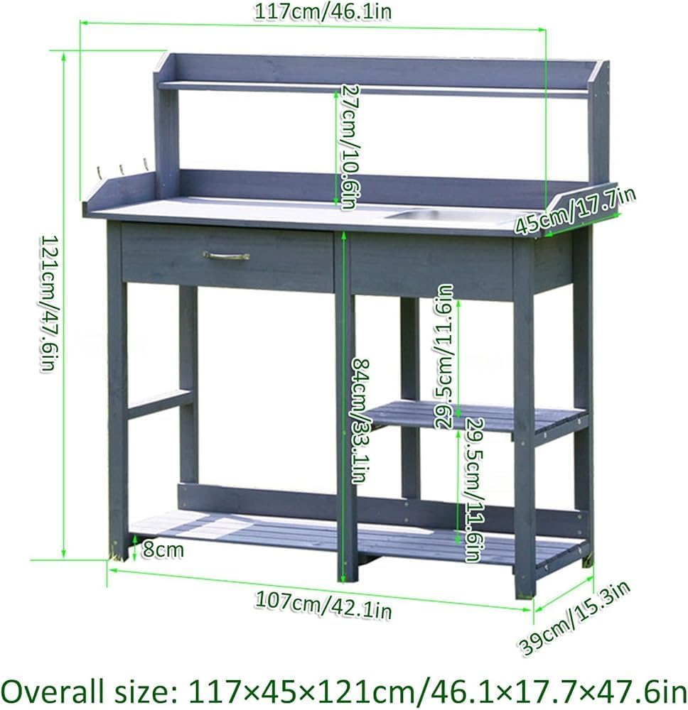 ?This fir wooden gardening console with an unadorned wooden look can harmonize with your garden or backyard. The thoughtful functions make it a dedicated gardening assistant. You can wash it with water or clean it with a cloth without worrying about the fine dirt getting into the wooden grains.?◀Product Specification▶Name: potting tableMaterial: Fir WoodenColor: as shown in the figureApplicable population: allOverall size: 117×45×121cm/46.1×17.7×47.6in?◀Please Pay Attention To Warm Tips▶1. About the sales list -------- We only sell potting table, and the contents in other pictures are not included.2. About color -------- Due to different camera, shooting light and computer settings, the actual color may be different from the picture. Please refer to the actual product, but this is not a quality problem.3. For size -------- manual measurement data, please have a slight deviation. There may be a deviation of about 1cm, please refer to the actual product. Please understand this.4. About products -------- Please check the size and color before purchasing. We have many similar popular products. Please click to enter our store and many other products to meet your style and needs.5. About service -------- We hope you are satisfied with your purchase. If you have any customer service problems, please feel free to contact us, thank you!