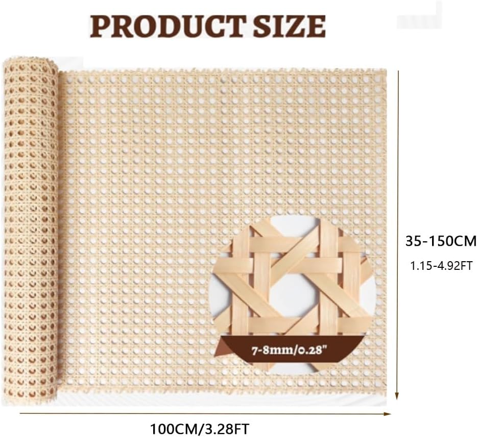 Are you tired of the same old furniture? Do you want to add something fresh and creative to your home? Then, you will definitely not miss our rattan material, which allows you to easily create your own rattan style, give your furniture a new look, and make your life more interesting and beautiful.Whether it's a modern minimalist style or a traditional vintage style, it can be easily integrated into it and add a unique aesthetic.Specification:Name: Hand-woven rattan mesh rollMaterial: PE (Polyethylene)Color: wood, brownLength: 100cm/3.28ftWidth: 35-150cm/13.8-59"Make or repair rattan beds, wicker chairs, headboards, sideboards, chests of drawers, armchairs, cabinet doors, or lampshadesFeatures:Non-fading, waterproof, long-lasting, durable, not easy to break or deform, long service lifeRattan is easy to use and can be used in many occasions such as home, office, kitchen, living room, bedroom, etc.Used for chairs, sofas, tables, recliners, swings or baskets, storage boxes and some other furniture.Note:Chromatic aberration can occur due to factors such as the light and screen of the shot. Please refer to the actual product.Due to manual measurement, an error of 1-3cm may occur.