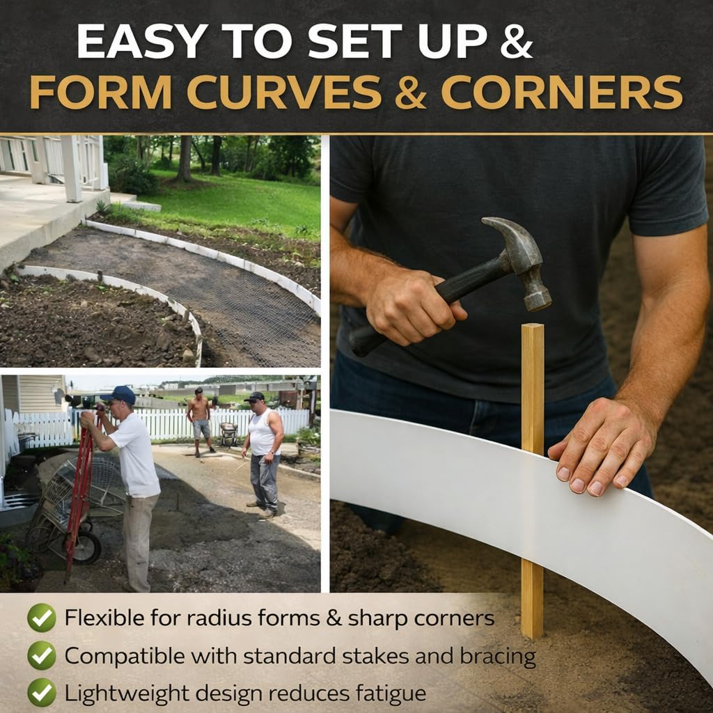 Build smooth, professional-quality curves in concrete with these Flexible Plastic Concrete Forms from Walttools. This 4-piece set (each form strip measures 4 in wide × 95 in long) lets you easily shape curbs, flatwork edges, curved steps, patios, walkways, and more — perfect for both DIY home builders and professional contractors. These heavy-duty flexible form guides bend and hold their shape, enabling you to create custom curves without expensive or complex form systems. Set them up quickly before your concrete pour and use stakes to secure them in place — they resist cracking and bending under pressure, yet are lightweight and easy to adjust. Whether you’re contouring for decorative patios, forming rounded edges on concrete steps, or adding landscape accents, these flexible concrete forms make it easy to achieve consistently smooth results. Reuse them on multiple jobs — from driveways to garden paths — for reliable performance every time.