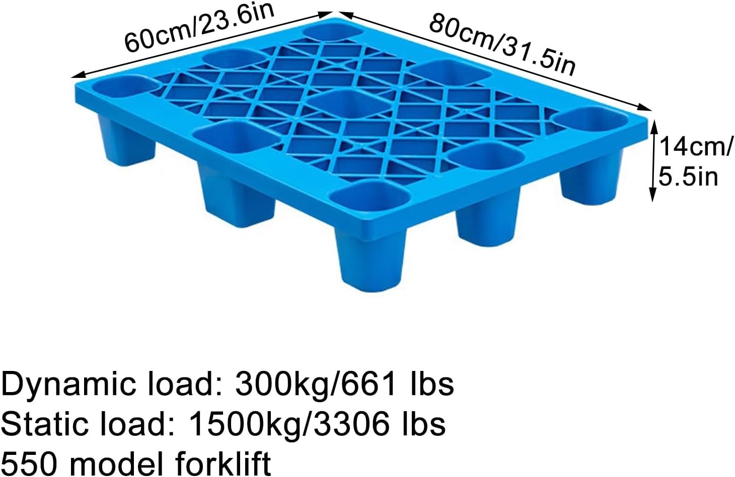 YXLLGS Professional industrial plastic pallets used for goods storage and transportationProduct Features:1. Made from high-density polyethylene, offering excellent toughness and temperature resistance from -40°F to 275°F2. The grid structure and integrated ribs distribute weight evenly for superior durability3. Available in 2-way and 4-way entry designs, compatible with 550 / 685 forklift models4. Stable interlocking stacking reduces storage footprint by up to 70%5. Rounded edge design minimizes damage during handling and protects goods6. Ideal for warehouses, transportation, supermarkets, and factory environmentsProduct Specifications- Material: HDPE- Color: Blue- Size(L x W x H) and Load-bearing31.5 x 23.6 x 5.5 in Dynamic load: 661 lbs Static load: 3306 lbs31.5 x 31.5 x 5.5 in Dynamic load: 661 lbs Static load: 3306 lbs35.4 x 35.4 x 5.5 in Dynamic load: 661 lbs Static load: 3306 lbs39.4 x 31.5 x 5.5 in Dynamic load: 1102 lbs Static load: 4409 lbs39.4 x 35.4 x 5.5 in Dynamic load: 661 lbs Static load: 3306 lbs43.3 x 31.5 x 5.5 in Dynamic load: 881 lbs Static load: 3968 lbs43.3 x 35.4 x 5.5 in Dynamic load: 881 lbs Static load: 3306 lbs47.2 x 31.5 x 5.5 in Dynamic load: 1102 lbs Static load: 4409 lbsPacking list:1 x plastic pallet