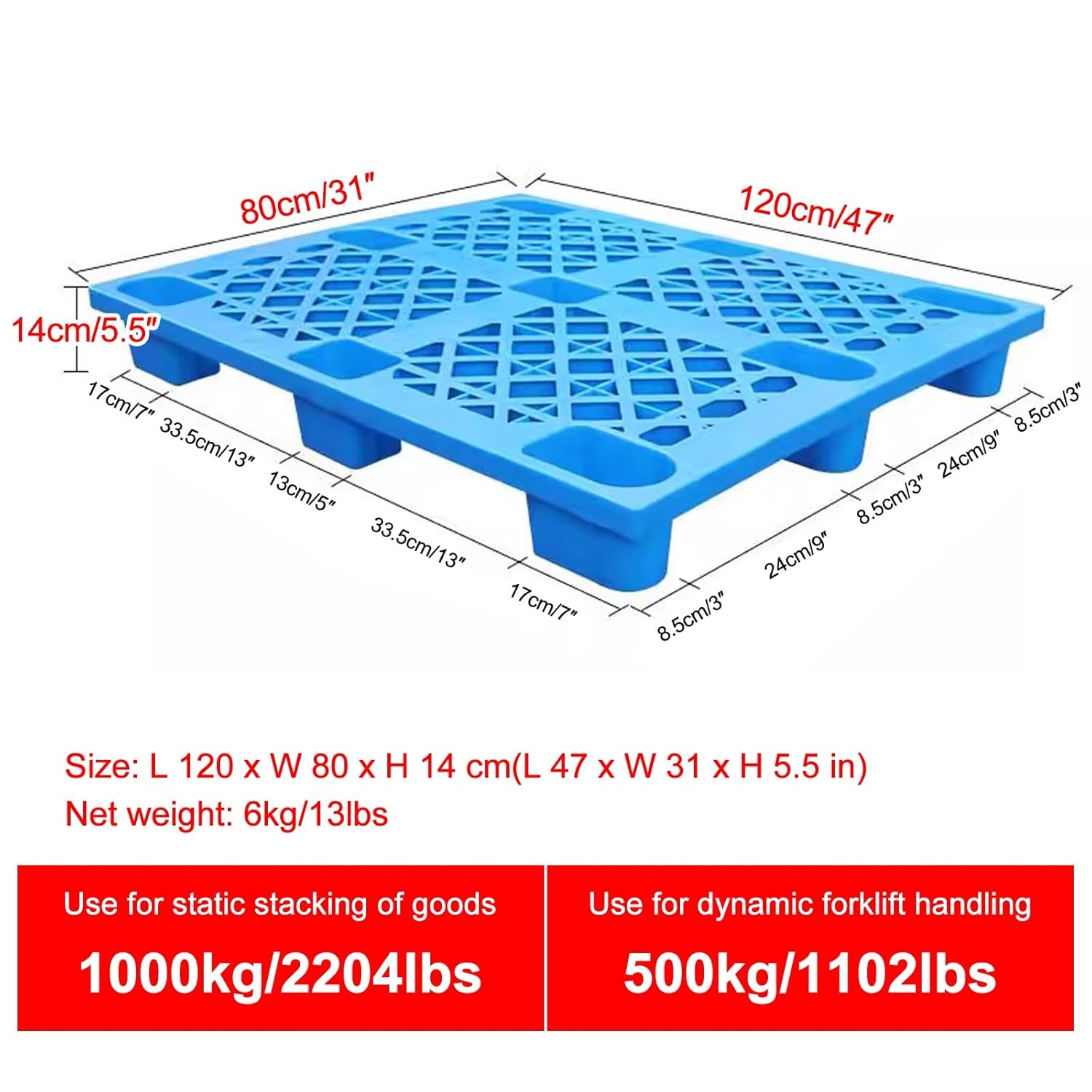 CLLXDZ Plastic pallets for basement storageMaterial: HDPESize:80x80x14cm/31x31x5.5in100x80x14cm/39x31x5.5in100x100x14cm/39x39x5.5in110x110x14cm/43x43x5.5in120x80x14cm/47x31x5.5in120x100x14cm/47x39x5.5inStatic load: 1000kg/2204lbsDynamic load: 500kg/1102lbsHigh temperature resistance: 135℃Low temperature resistance: -40 ℃Notes:1. If a small manual hydraulic truck or forklift uses a large pallet, the middle of the pallet will be stressed but the sides will not be stressed, which may cause the goods to collapse and the pallet to be damaged. Please choose a matching pallet for use2. Please place the goods evenly and stack them horizontally and vertically to make the stress surface of the pallet even, which is not easy to cause bending, damage or breakage, and can make the pallet have a longer service life