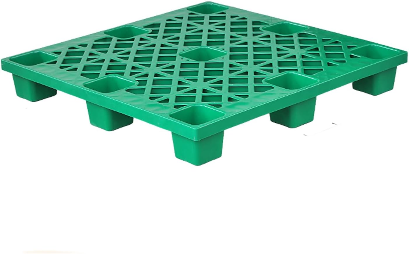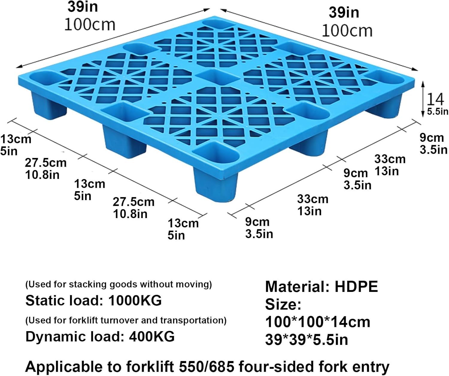 Plastic pallets replace wooden pallets and are easy to clean. Just rinse with water.The hollow surface design is ideal for storing products high above the cold and wet floor.It is waterproof and moisture-proof while keeping air circulation at the bottom of the stacked goods.Basic information:Product name: Plastic palletColor: Blue, Gray, Green, Red, YellowMaterial: Plastic and high-density polyethyleneProduct weight: 5 kg/11 poundsStatic load: 1000 kg/1 ton/2200lbsDynamic load: 400kg/880lbsProduct size: 100*100*14cm (39*39*5.5in)Features: strong and durable, waterproof, sun-proof, wear-resistant, cold-resistant, strong load-bearing capacity, can be stacked and stored to save space.Suitable for various applications: industry, agriculture, landscaping, camping, warehouse, toilet, storage room, balcony, outdoor.Package content: plastic moisture-proof mat x 1
