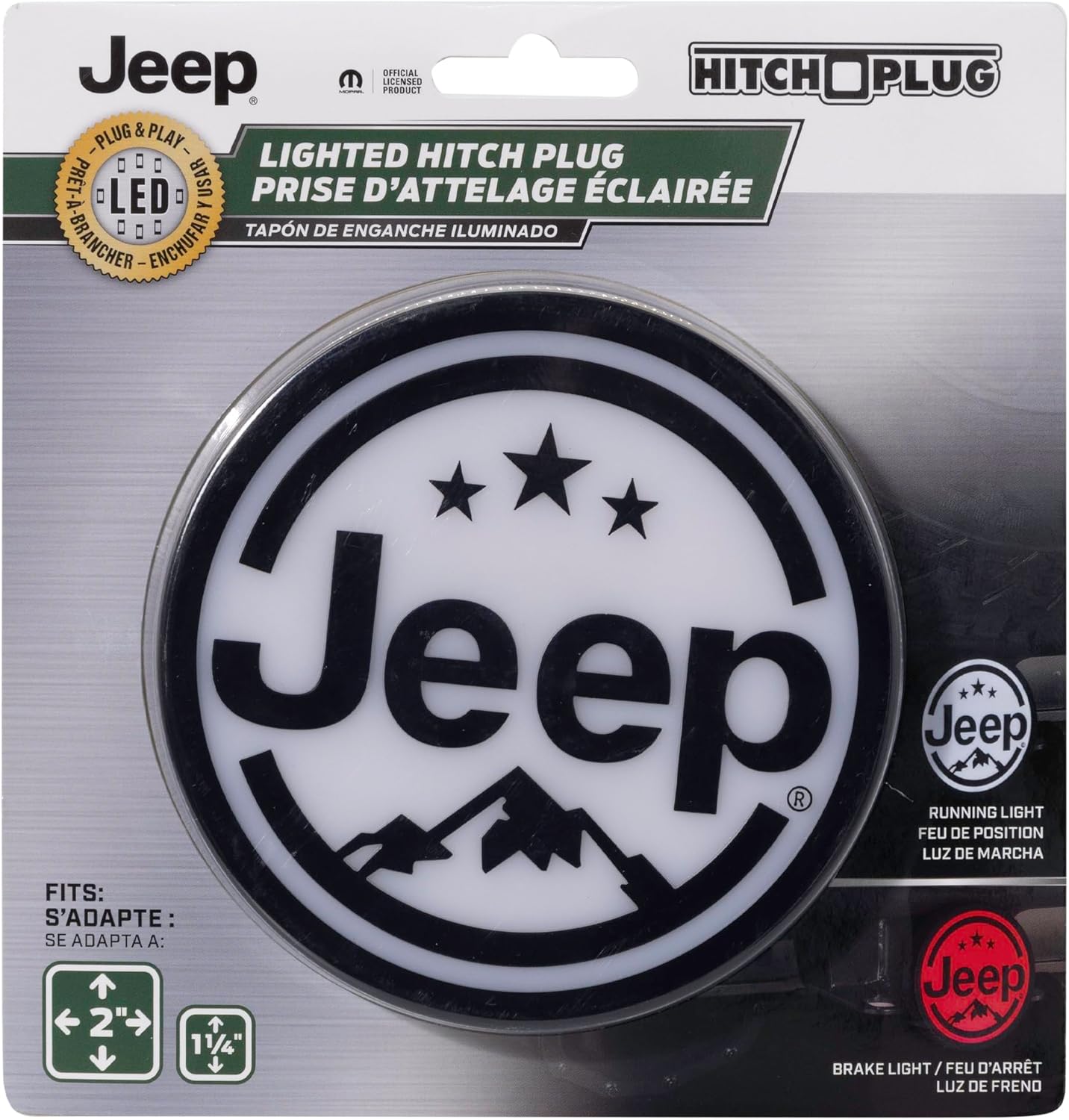 Plasticolor’s Jeep LED Lighted Hitch Plug is an Officially Licensed Product that adds a stylish touch to your vehicle. Not only does the Cover keep the receiver clean and ready, but it connects easily to your vehicle light wiring harness. This allows it to act as a cool additional running light and RED Brake light when your brakes are applied. Hitch Plug is made of durable plastic and is corrosion resistant. The package includes receiver stems for BOTH standard hitch sizes, 2 inches and 1-1/4 inches, and the stems have multiple installation holes for the locking pin (Locking Pin not included), so this plug will fit a wide range of hitches. The screws for attaching your chosen receiver stem are also included. This Hitch Plug is an essential addition for all Jeep fans! Requires use of a hitch pin or lock NOT INCLUDED to secure this item to your vehicle.