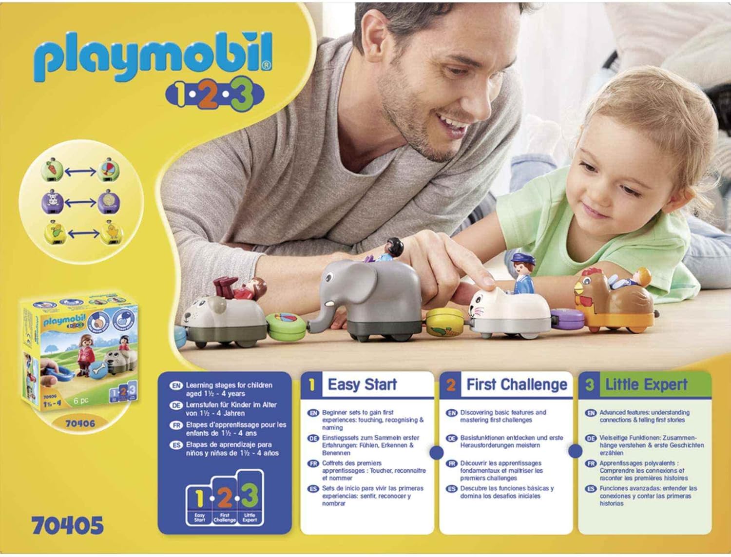 Push, click, arrange! There is always something new to discover aboard the Animal Train. With a bright and colorful design and large, rounded pieces, this PLAYMOBIL 1.2.3 Stage 3 - Little Expert set will help your toddler develop fine motor, creative, and language skills as they set off down the tracks for a traintastic adventure. The animals serve as train coaches, which can be separated or connected in any order to make a train. Assign the picture pieces to the animals and tell your own little stories: the chick runs after the chicken, the elephant eats a carrot, the cat plays chases the ball of yarn and much more. This Animal Train can be combined with the Dog Train Car (70406 - sold separately). Playset includes conductor figure, girl figure, elephant train car, cat train car, chicken train car, and 6 connectable story pieces. Recommended for ages 18 months to four years.