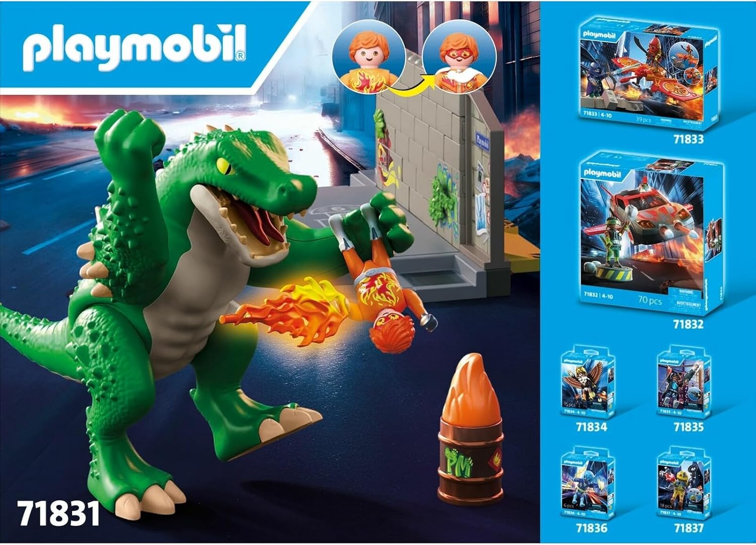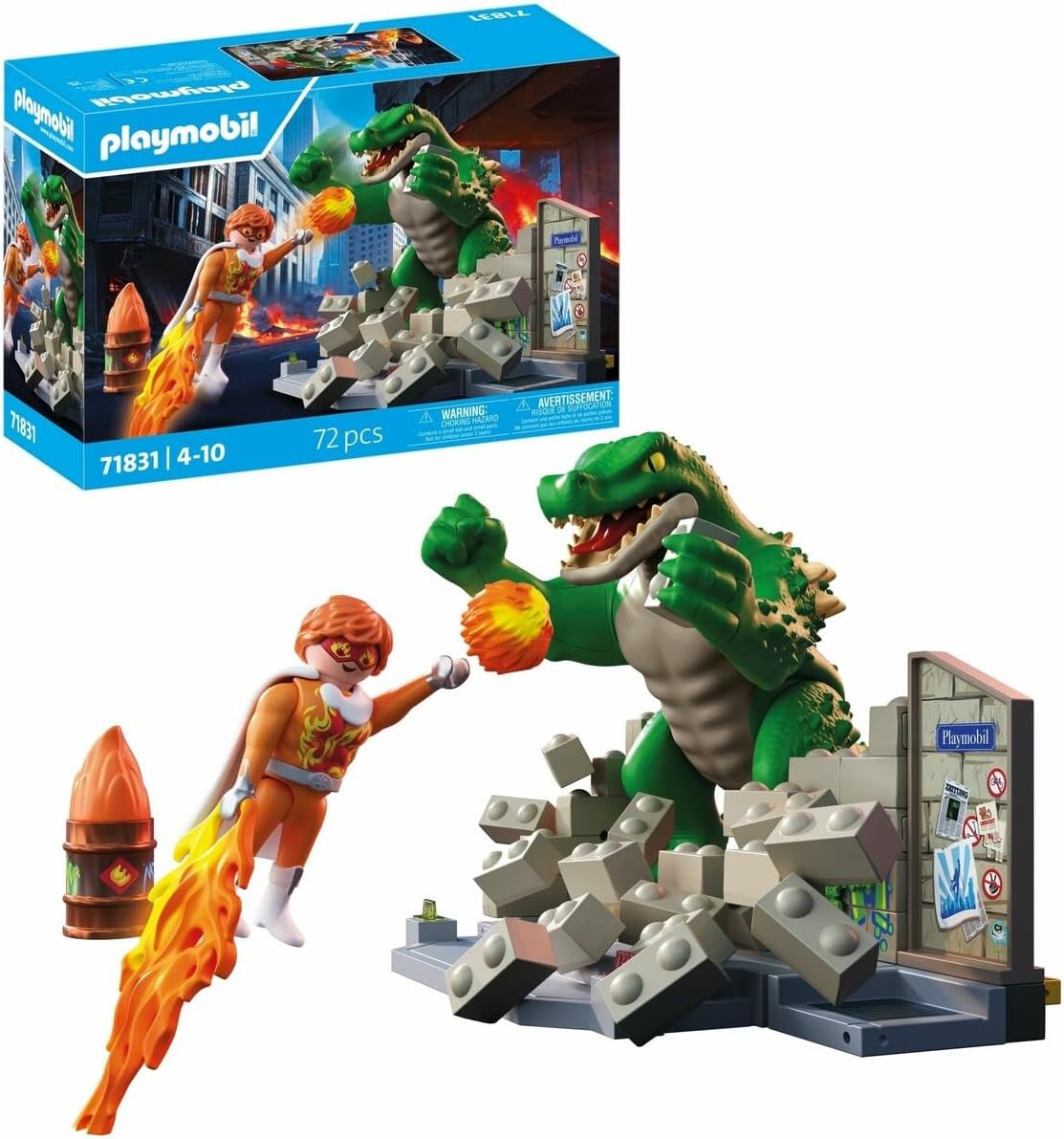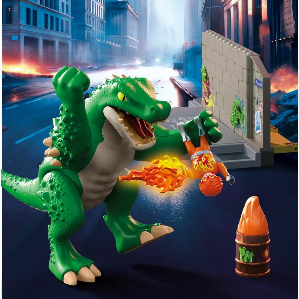 Danger strikes PLAYMOPOLIS as the colossal MegaRaptor crashes through the city walls! With a smashing arm, gripping claw, and snapping jaws, the giant lizard is a force of fiery destruction. But the heroic Firestormer is ready – armed with blazing, removable fireballs, a cape, and fierce determination. Firestomer’s interchangeable facial expressions add to the drama. The destructible wall creates explosive fun, crumbling under every strike and rebuilding for endless replay. Packed with detailed accessories like flames, plants, and a hidden barrel, this action-loaded PLAYMOBIL Heroes playset delivers heroic showdowns and epic creature battles straight to the playroom! Recommended for ages four to ten years. Warning. Choking Hazard. Small Parts. Not for children under 3 years.