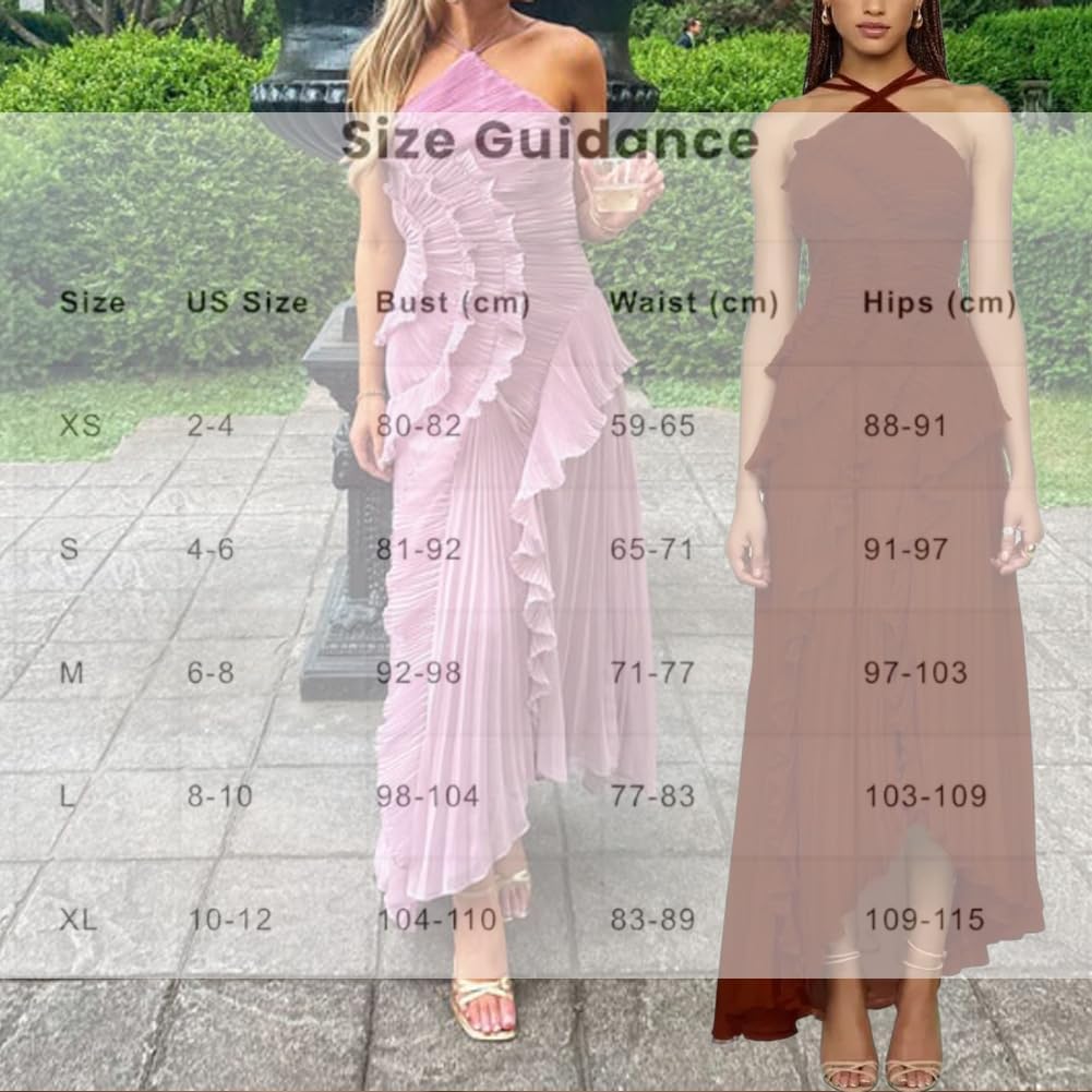Women Ruffle Pleated Long Dress Sleeveless Halter Irregular Tiered Pleated Flowy Chiffon Dresses for Wedding Guest, Summer Cocktail Evening Product Highlights: * Halter neck, sleeveless, backless silhouette * Pleated lotus edge design with asymmetrical hem * Tiered ruffle layered skirt with flowy movement * Chiffon fabric, lightweight and breathable * Slim, elegant formal style for weddings and evening events Advantage: 1. Show your perfect body curves. 2. Stunning ruffle hem. 3. Soft and breathable, comfortable to wear. Specification: Fabric: 80%Chiffon, 20%Polyester Pattern: Solid color Collar type: No collar Placket: Pullover Waist type: High waist Popular elements: Wood ear Size: XS, S, M, L, 2XL Emballage inclus: 1PCS: Formal Dresses for Women Summer Halter Sleeveless Flowy Midi Dress Note: 1.Due to manual measurement, please allow a difference of 1-5g/1-2cm. 2.Due to different displays and different lighting, the picture may not reflect the actual color of the item. Thank you for your understanding.