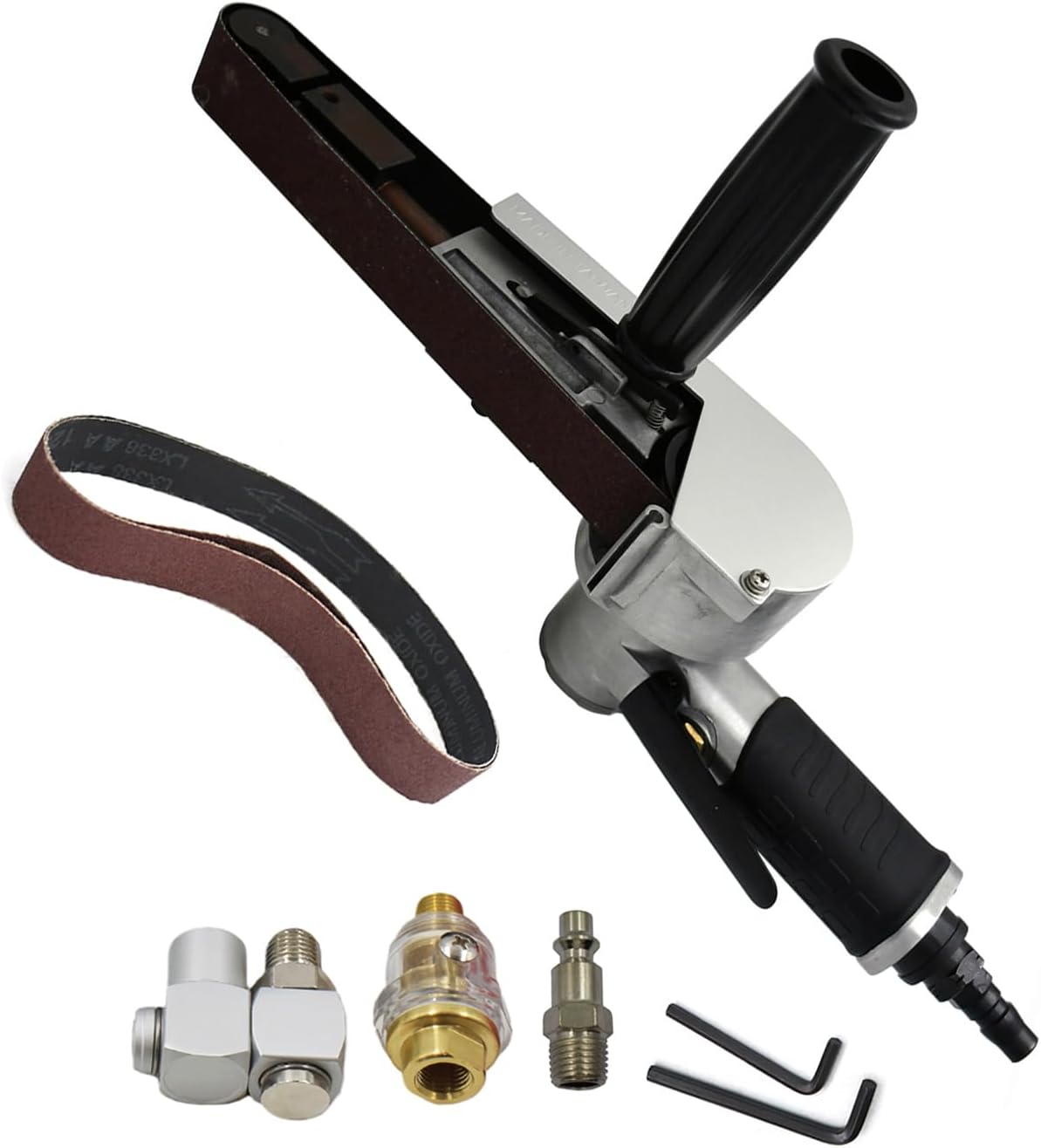 Include : Air Belt Sander *1360 Degree Connector *1 Oil feeder *1Connector *1belts *6Pneumatic Air Belt Sander :1/2" x 18" , 18000RPM ,1.2KG360°adjustable arm ,Adjustable Speed Easy to operate, quick change sanding belts,With 6pc BeltsPolishing tool: Ideal for surface grinding and trimming of cast aluminium products, wood, glass, steel and metal products, it can remove bristles, chamfering, coating and achieve polishing,grinding, rust removal ;gringing spot weld, metal finishing and deburring, car collision repair, auto body workSuitable for polishing and grinding in tight spaces, corners, and hard-to-reach areasRepair tool used for scratches and wear on car surfaces and car sheet