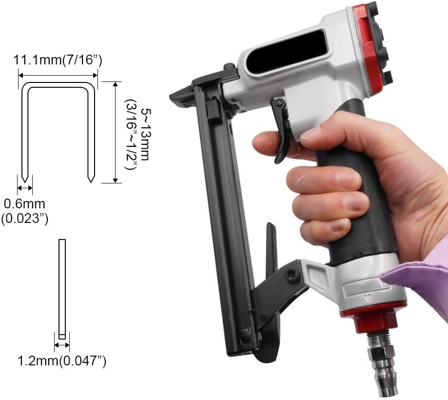 1. Equipped with a safety touch switch for rapid continuous firing, ensuring efficient and seamless without jamming, making nail driving quick and hassle .2. Streamline body design, Simple color design,nice-looking and pleasing to the eye ,Lightweight and portable, flexible and convenient,It also fit for operating in small space.3. Upper exhaust cover made of cast iron, Applicable to knocking at nails directly,Special striker design, stable and reliable qualitySpecification:Model Number : 1013JSize:H : 7-1/6" (179 mm)L : 9-1/2" (242 mm)W : 2-3/8" (60 mm)Nail Capacity:100 StaplesApplications:Furniture ManufacturingPower Source : PneumaticType : Nail GunNail length :5-13mmDescription:Air-Powered: Pneumatic staple guns are powered by compressed air, making them highly efficient and capable of delivering consistent and powerful stapling performance.Staple Compatibility: This staple gun is designed to accept 20 gauge staples with a width crown of 7/16 inches. It's important to use compatible staples to ensure proper functionality and optimal results.Ease of Use: Pneumatic staple guns are typically designed with user-friendly features, such as ergonomic handles and easy-to-operate triggers, to enhance comfort and control during operation.Package list :1pcs Pneumatic nail gun
