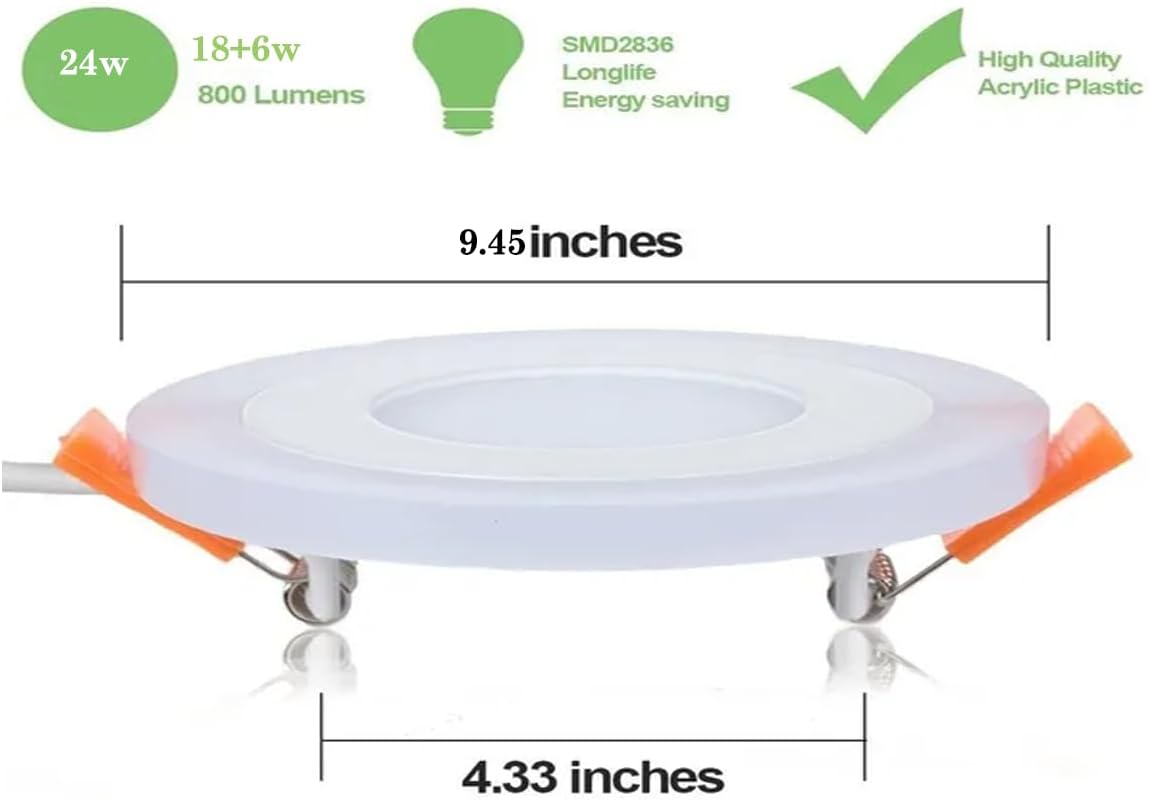 Product Description: 18+6W: 1,inside Panel 18W (Warm White 3000K/Cold White 6000K) + Outside is 6W(Blue) 2,Light Modes: 0utside Light - Inside Light - Both Light 3,Input Voltage: AC 85-265V 4,Lumen: 1920-2160lm 5,Shape: Round 6,CRI: > 80 7,Size:240mm x 240mm(9.45 inch) 8.Cut Hole Size:210mm(8.26 inch)