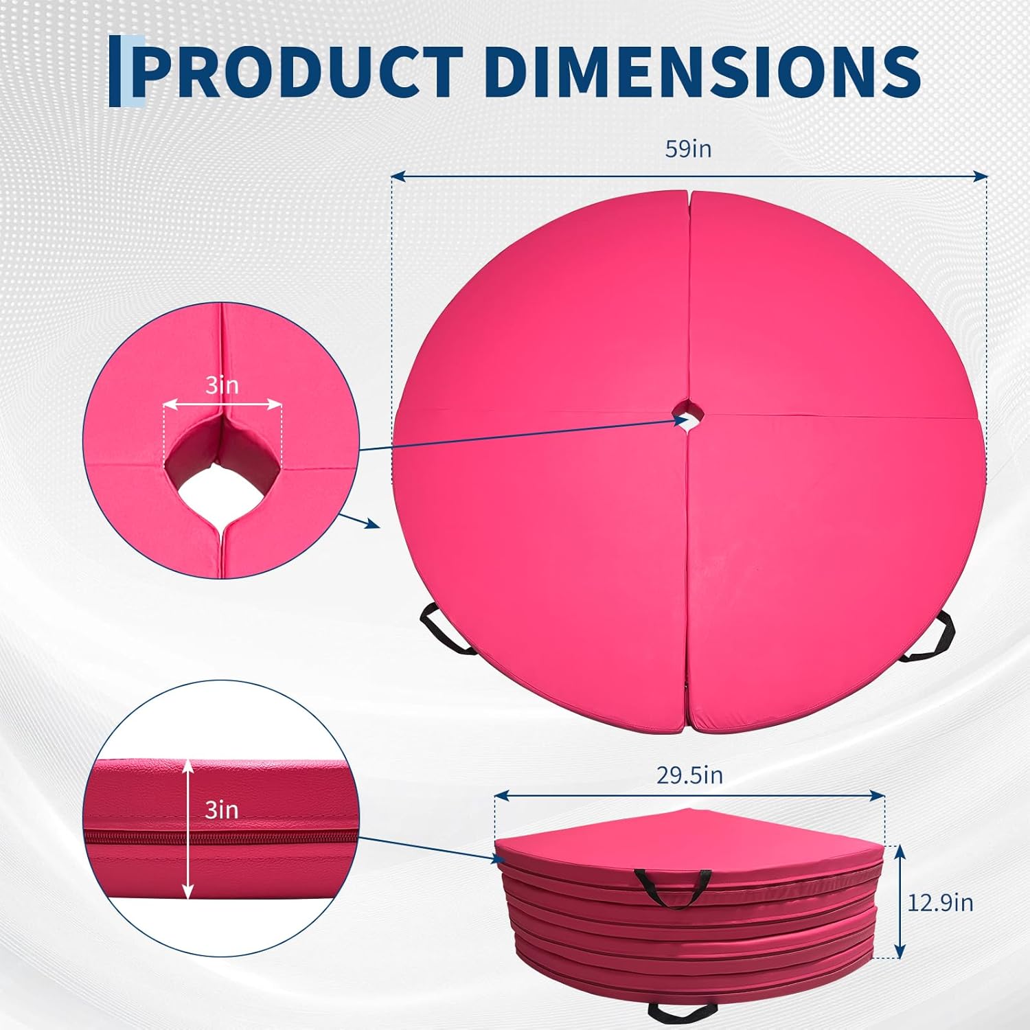 Name: Pole Dance Crash MatColor: BlackMaterial: PU and EPEThickness: 3 InchDiameter: 59 InchHole Diameter:3 InchPackage List: 1* Folding Dance Mat