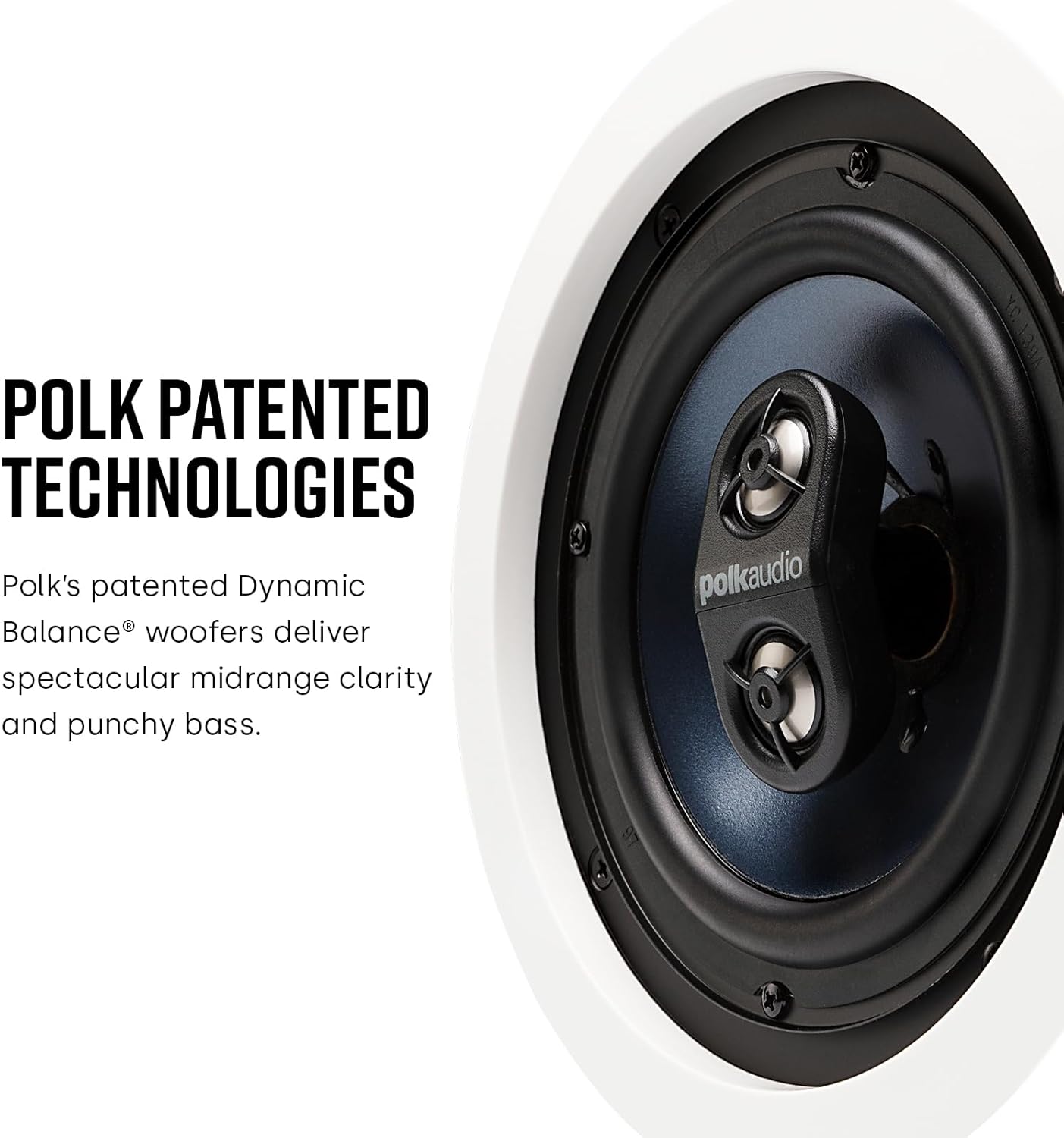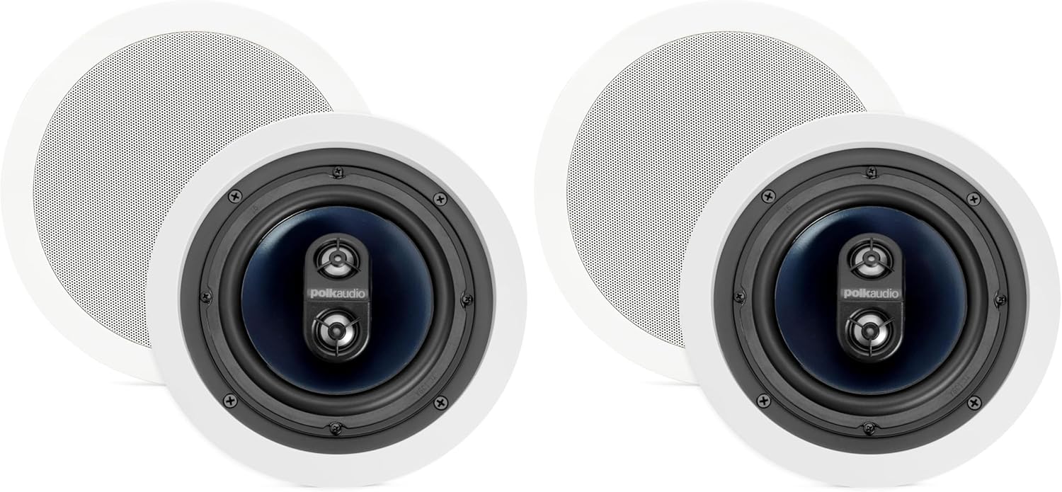 The Polk RC6s In-Ceiling 6.5 inch Speakers deliver full stereo sound from a single overhead location. Used by home audio enthusiasts, this speaker is perfect for bathrooms, kitchens, hallways, or any space where you want great audio without multiple speakers. Its Dynamic Balance woofer and dual dome tweeters provide lifelike stereo imaging with crisp highs, a smooth midrange, and deep bass—all from one discreet speaker. Installation is quick and hassle-free: cut a hole, feed the wires, and drop the passive speakers in. Rotating cams lock it securely in place, ensuring vibration-free performance with no extra assembly or mess. Designed to blend in, the paintable grille and low-profile design, which mimics a recessed light fixture, make the RC6s virtually disappear into your ceiling. Get premium, space-saving home entertainment without sacrificing performance.