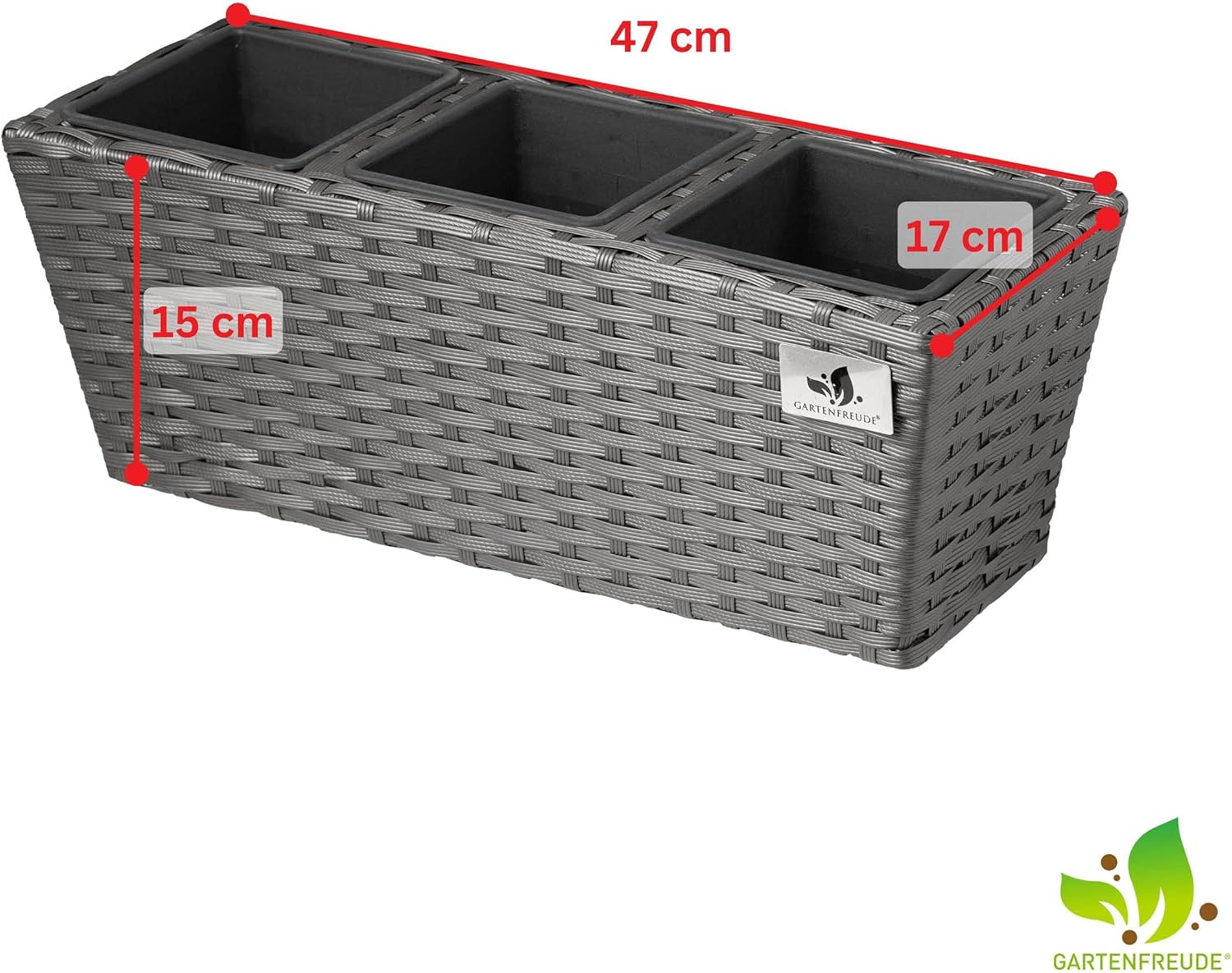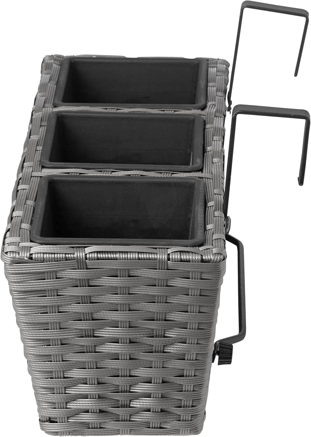 The Gartenfreude polyrattan balcony box set including suspension sets decorative accents on your balcony. The balcony boxes are made with high-quality PE plastic mesh woven over a metal frame. The fibre is UV and temperature resistant, durable and easy to clean. The balcony boxes are divided with three plastic inserts.