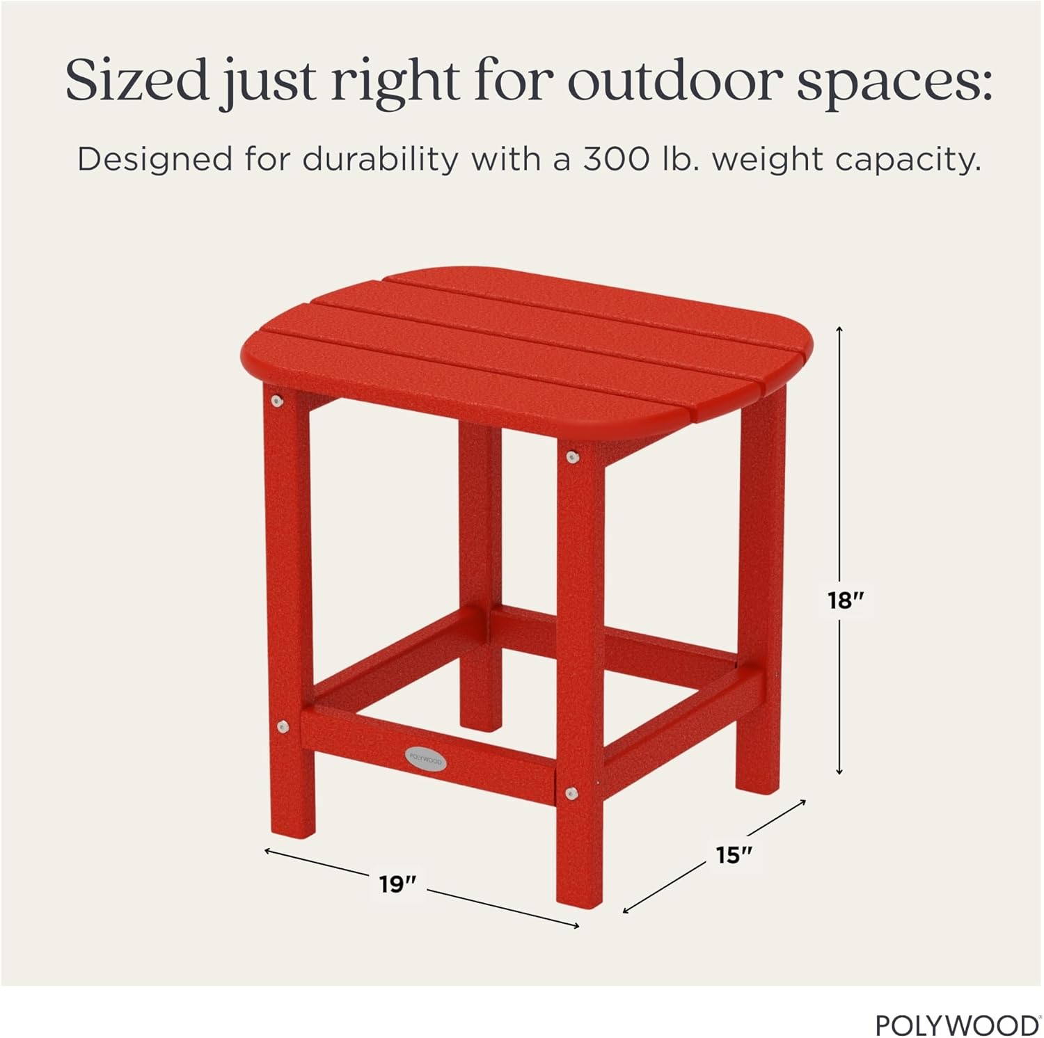 The charming, all-weather POLYWOOD South Beach 18" Side Table is an extremely versatile accent piece for your outdoor seating area. It's just the right size for resting drinks and snacks, making it the ideal companion to the South Beach Adirondack Chair, Dining Chair, Chaise Lounge or Rocking Chair. It's available in a variety of stunning, fade-resistant colors so you can mix and match to create your own personal style on your deck, porch, or patio. Made in the USA and backed by a 20-year residential warranty, this sturdy table is constructed of solid POLYWOOD recycled lumber that has the look of painted wood without the maintenance real wood requires. It won't splinter, crack, chip, peel or rot and it never needs to be painted, stained or waterproofed. It’s easy to clean with soap and water. This worry-free table is also resistant to stains associated with wine and condiments, corrosive substances, salt spray and other environmental stresses.