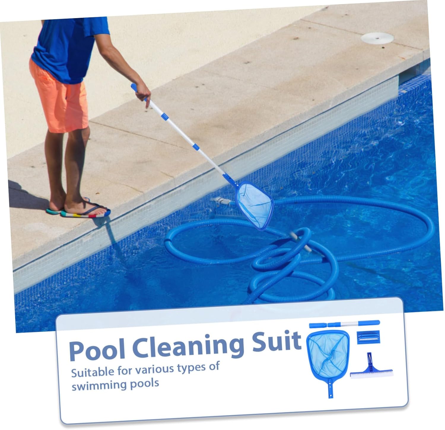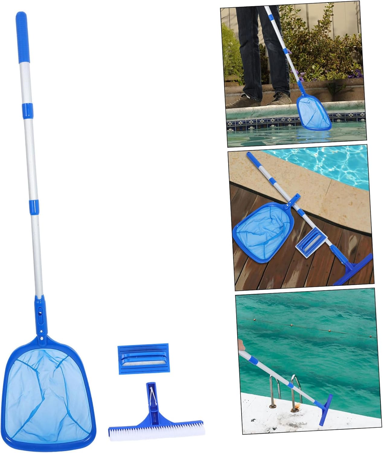Package Include 1 x Pool Cleaning Brush 1 x Sponge Brush 1 x Skimmer Net 1 x Pole Features -Size:15.00X9.00X7.00cm/5.89X3.54X2.75in swimming pool supplies -Pool net cleaner: pool cleaning set with a rubber brush, sponge brush, net, and extendable pole for complete pool scrubber brush with pole -Size:25.00X14.00X4.00cm/9.82X5.50X1.57in pool net skimmer -Size:41.00X26.50X3.00cm/16.11X10.41X1.18in pool cleaning brush -Material:PP, Aluminum Alloy, Nylon pool net cleaner -Size:90.00X3.00X3.00cm/35.37X1.18X1.18in swimming pool brush -Pool skimmer net: Built to last, the set's components are resistant to deformation, ensuring consistent performance over time pool skimmer net -Pool cleaning brush: Suitable for different pool types, including residential and commercial pools, making it a versatile pool rake with pole -Pool brush with pole: Easy to handle and transport, the set includes adjustable pole for reaching every part of your pool effortlessly leaf net pole -Color:Blue pool cleaning kit with pole -Pool skimmer handle: Rubber and sponge brushes provide deep cleaning for pool floors and walls, while the net captures floating debris pool strainerGoods Descriptionpool scrubber The 10-inch rubber brush and sponge brush are designed to scrub away and grime from pool surfaces, while the skimmer net efficiently collects leaves and other debris.pool cleaning pole The adjustable pole makes it easy to clean hard-to-reach areas, ensuring your pool stays sparkling clean with minimal effort.pool brush with pole Say goodbye to pool cleaning hassles with our comprehensive pool cleaning kit