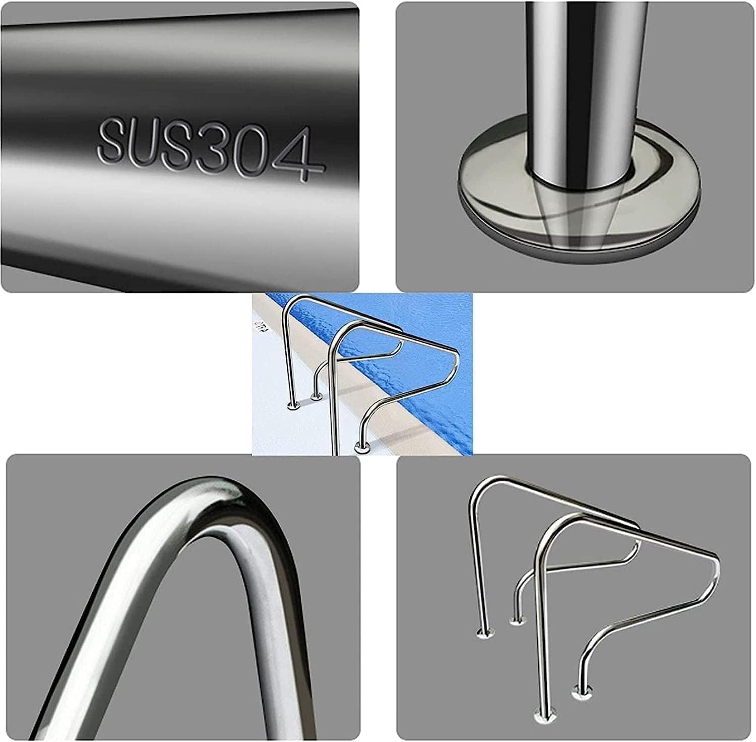 GIVE AWAY 4FT NYLON GRIP COVER : 4ft (122x12cm) (L x H); 4ft nylon handle cover ensures a comfortable surface to hold while providing excellent grip.It protects hands from the common dangers of burns and discomfort.;HIGH SAFETY: Equipped with a stable widened base,the pool handrail is firmly connected to the bent tube to ensure your safe use.And with strong load-bearing force,it helps you to enter or exit pool easily without worrying about rail's looseness.;304 STAINLESS STEEL: Made of premium 304 stainless steel,this swimming pool handrail is sturdy and durable for long-term use.It has good resistance to rust.And the smooth polished surface with great gloss makes it easy to maintain.;BEAUTIFUL CURVE :The pool handrail is designed with users-friendly curve,which conforms to the shape of hands for easy grasp.With minimalist and stylish design,this pool handrail is suitable for swimming pool with step,sloped entries,spa,water park ,etc.;EASY TO ASSEMBLE: The installation is convenient.If you have any questions during the installation process,please feel free to write to us and we will provide you with satisfactory after-sales service as soon as possible.Note: the ground hole by 0.5 inches drill bit.